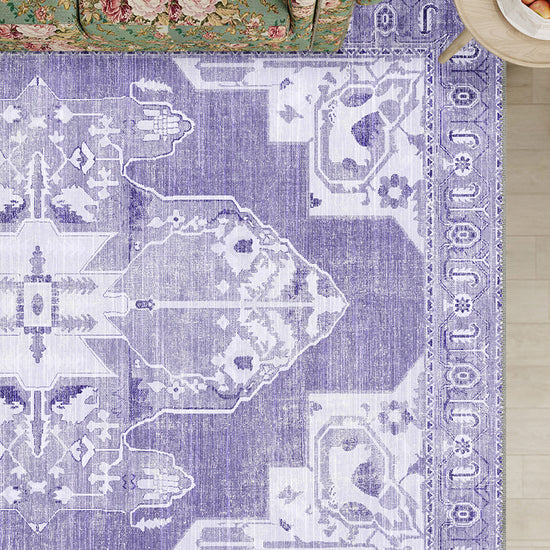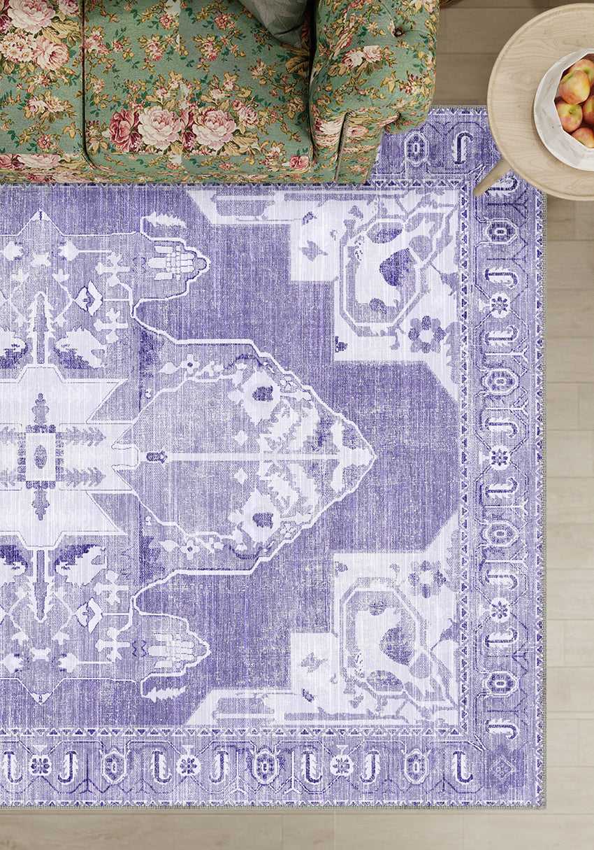 - Vintage-Inspired Design: The Adrian rug features a detailed medallion pattern reminiscent of traditional Persian rugs, but with a fresh, modern purple palette that stands out in contemporary interiors.