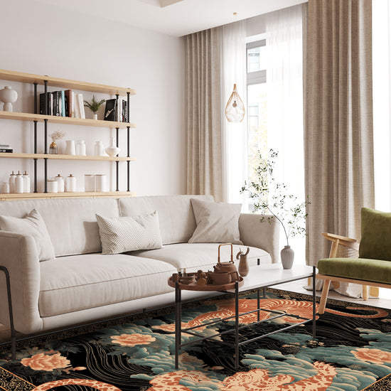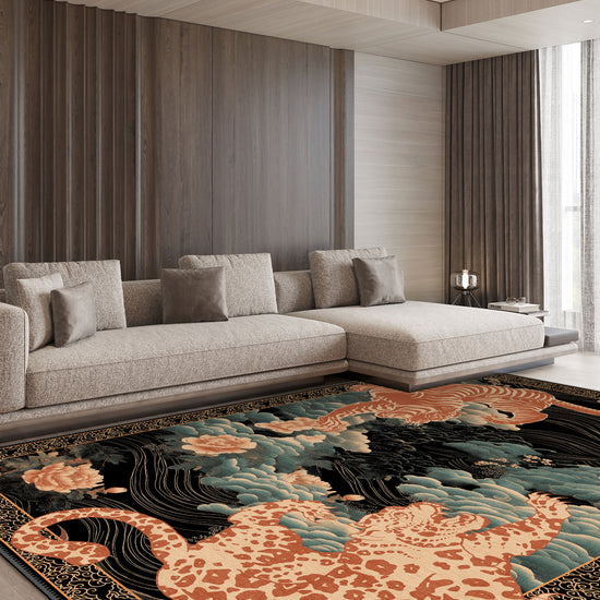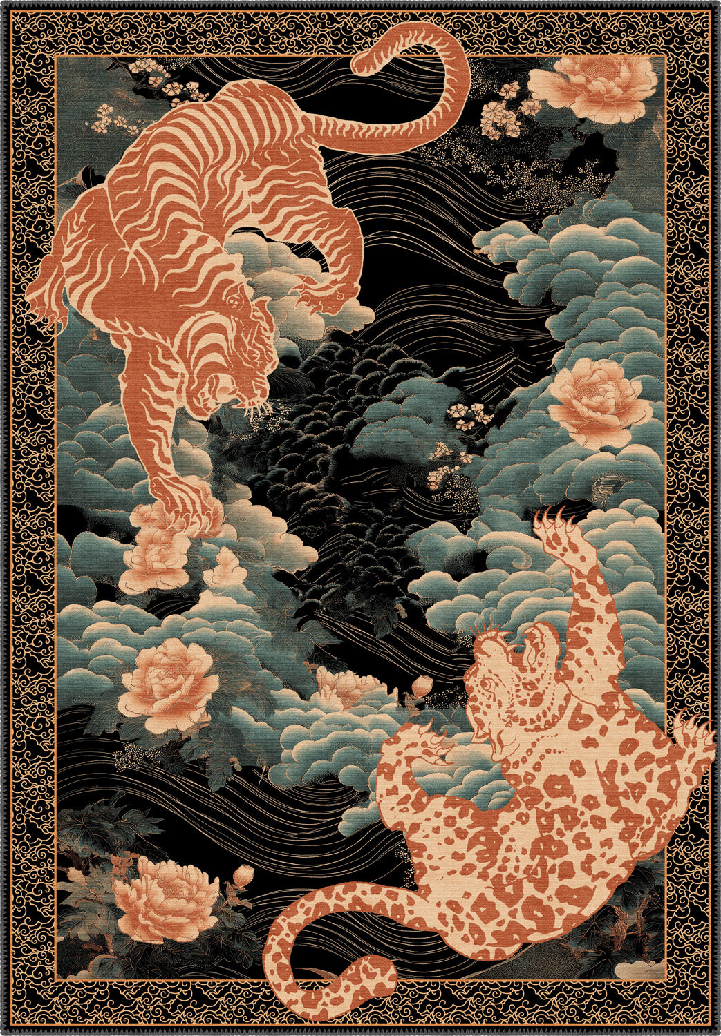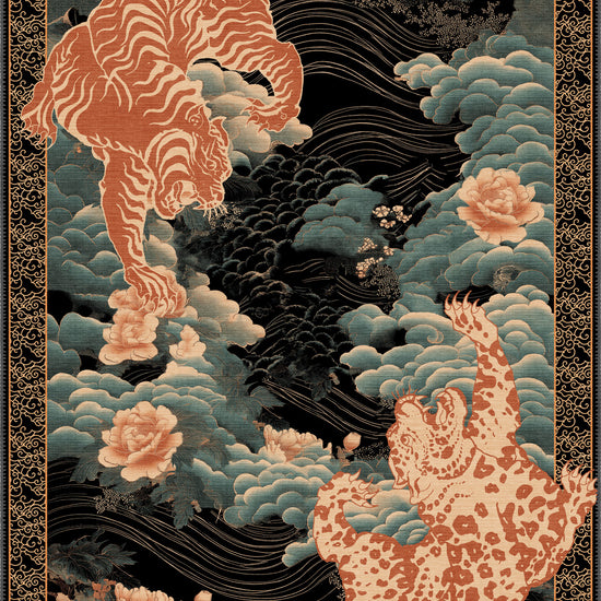 Step into a world where ancient myth meets modern interiors. The Akira Japanese Tiger Rug is a bold, cinematic centrepiece that conjures the spirit of Japanese artistry—two tigers caught mid-motion in a celestial dance among swirling clouds and blooming peonies. Framed in a luxurious ornamental border, every detail evokes power, grace, and storytelling.