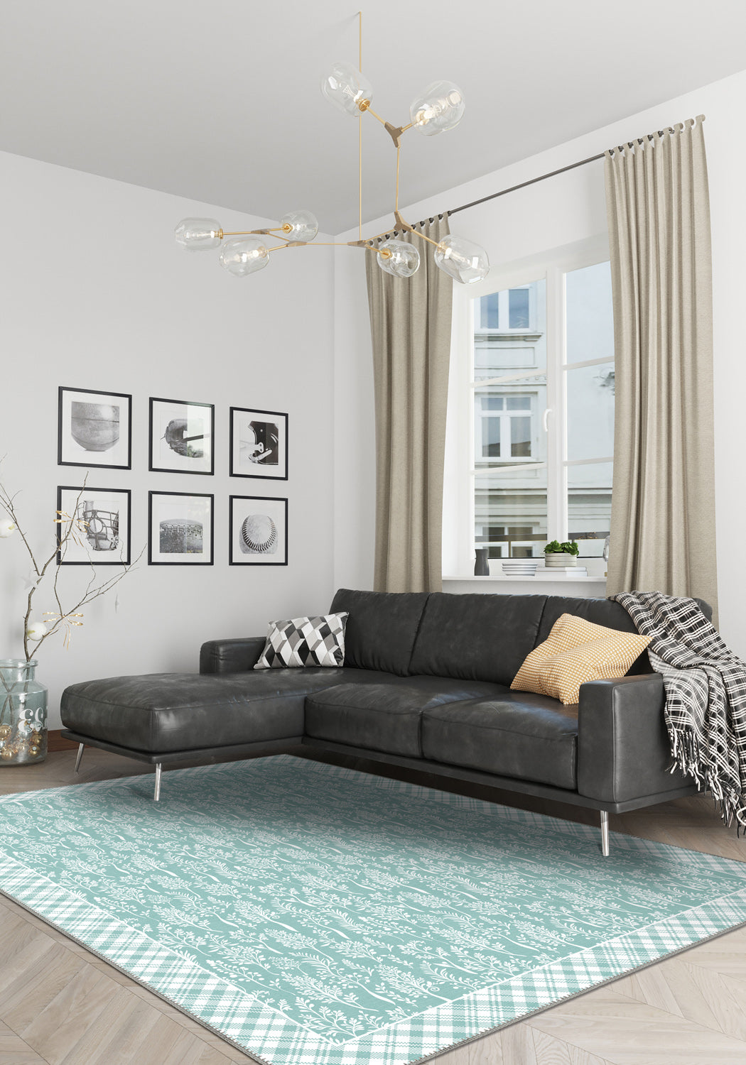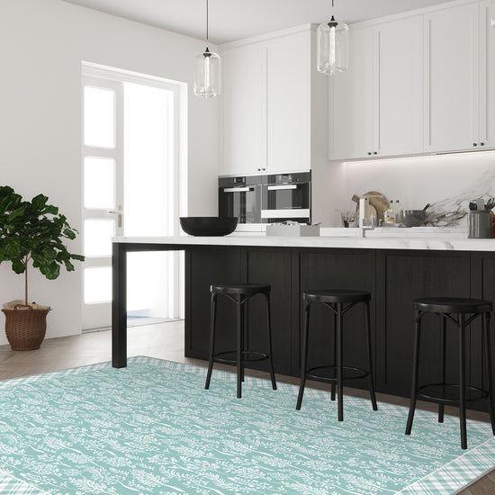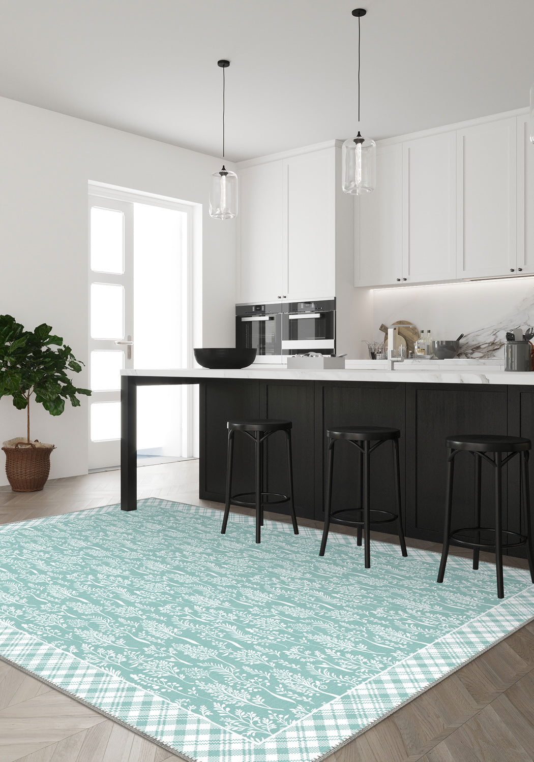 The Alder Cottagecore Duck Egg Blue Rug is a breath of fresh countryside air. Its soothing duck egg blue base is scattered with delicate white wildflowers, framed by a crisp gingham border in matching tones. Sweet, soft, and romantic, this design blends vintage cottage style with the ease of modern life. It brings a sense of calm to any room—like hanging freshly laundered linen in a garden full of blooms.