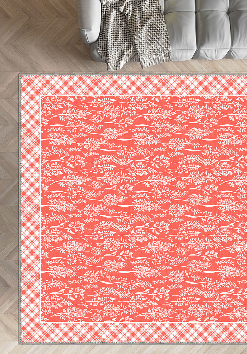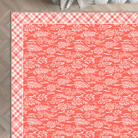 The Alder Floral Coral Rug is an ode to fresh blooms and sunny kitchens. With its dainty floral repeat and soft gingham-style border, this design feels like a vintage apron made into a rug. The coral tone is sweet but never sugary—cheerful, warm, and full of character.