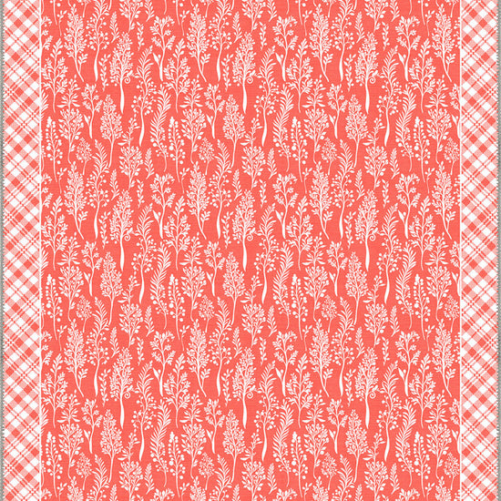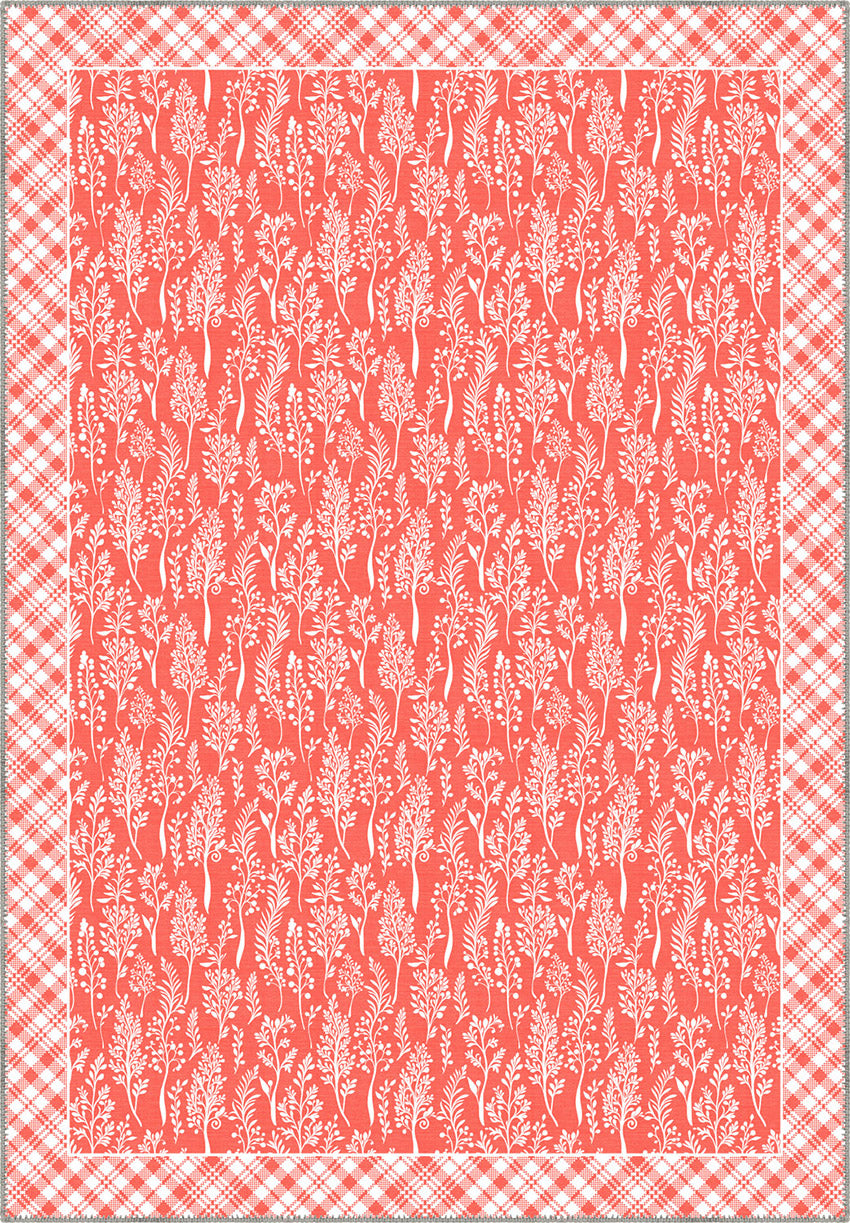 - Delicate white florals on a coral background, framed with a plaid-style border