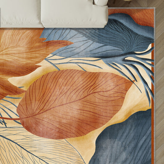The Althea Orange Floral Rug is a beautiful mix of bold colors and nature-inspired design, featuring warm orange, deep blue, and soft yellow tones in an oversized leaf motif. Perfect for adding a touch of warmth and charm, this rug enlivens both living spaces and kids' rooms. Its earthy palette combined with artistic flair makes it an ideal choice for modern, cozy, and playful interiors, effortlessly blending style with practicality.