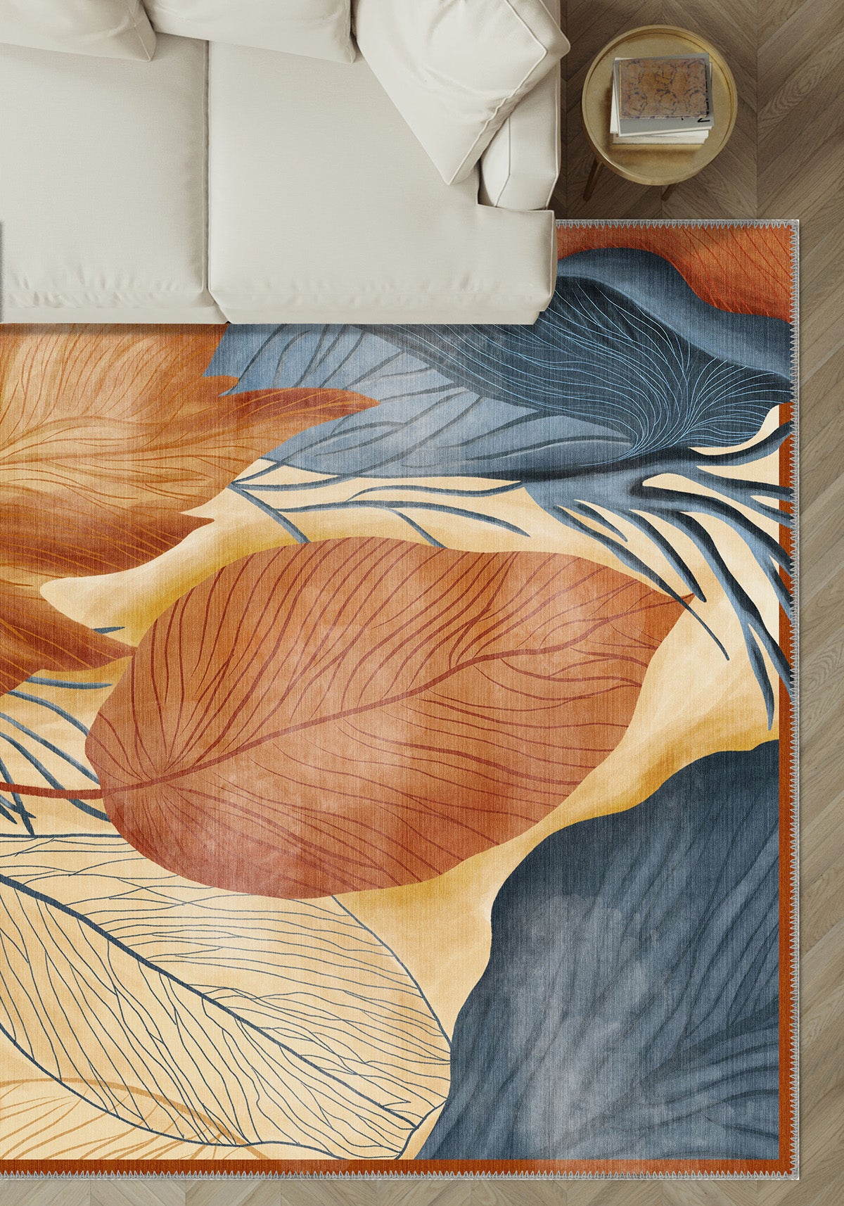 - Bold Leaf Motif: Large, whimsical leaves in rich orange, soft yellows, and deep blues create a playful yet elegant pattern that adds a nature-inspired, artistic touch to any room.
