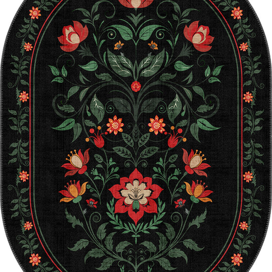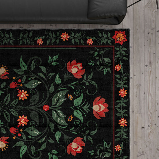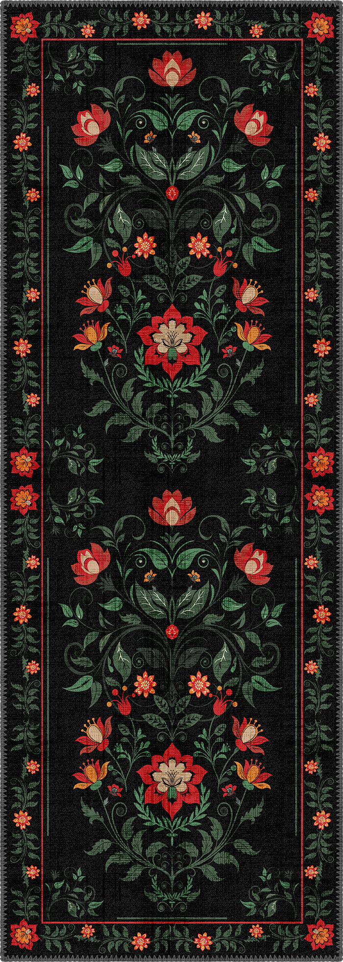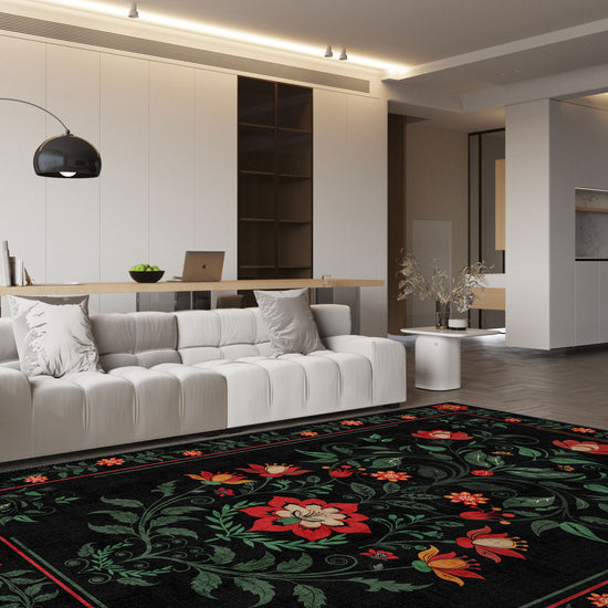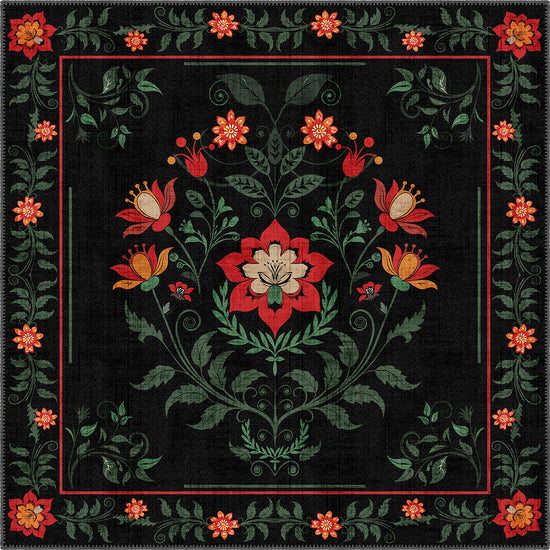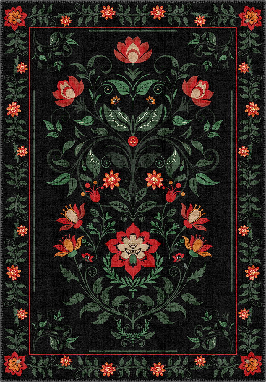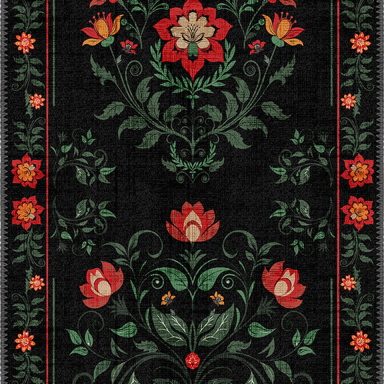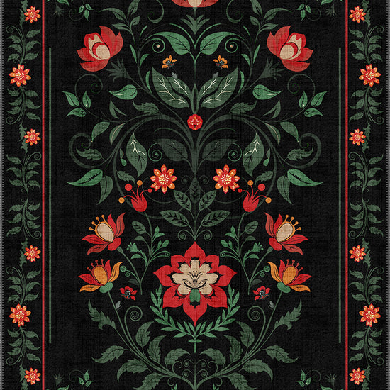 The Amara Black Anatolian Rug embodies the timeless artistry of Anatolian textiles, where intricate florals bloom against a bold black base. The symmetrical design features vivid red and orange blossoms entwined with deep green leaves, bordered by delicate floral garlands. Rich in symbolism and steeped in tradition, this rug adds both elegance and storytelling to your home.