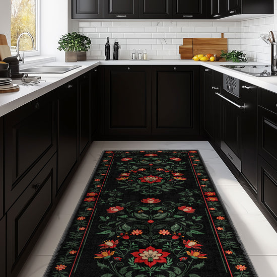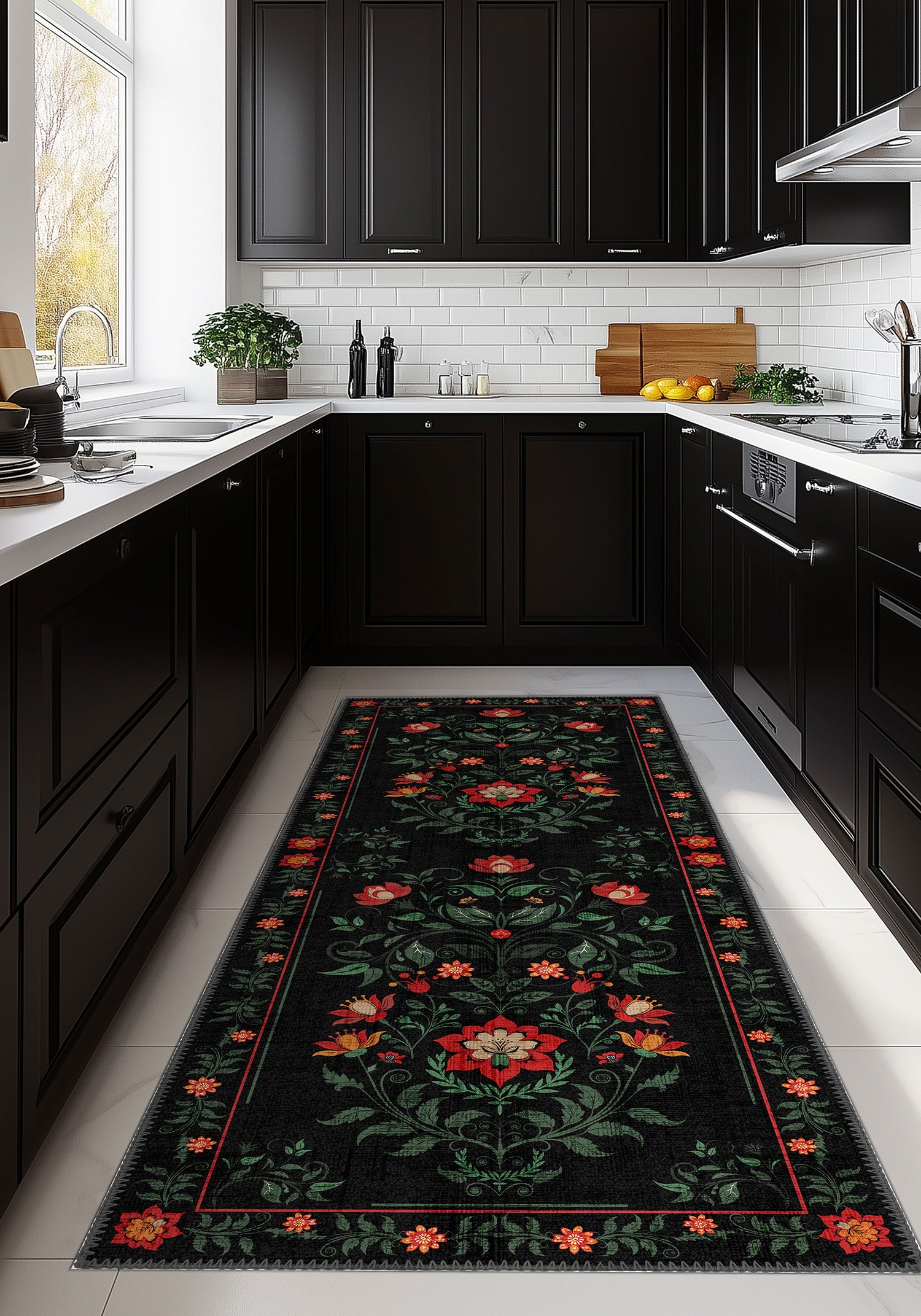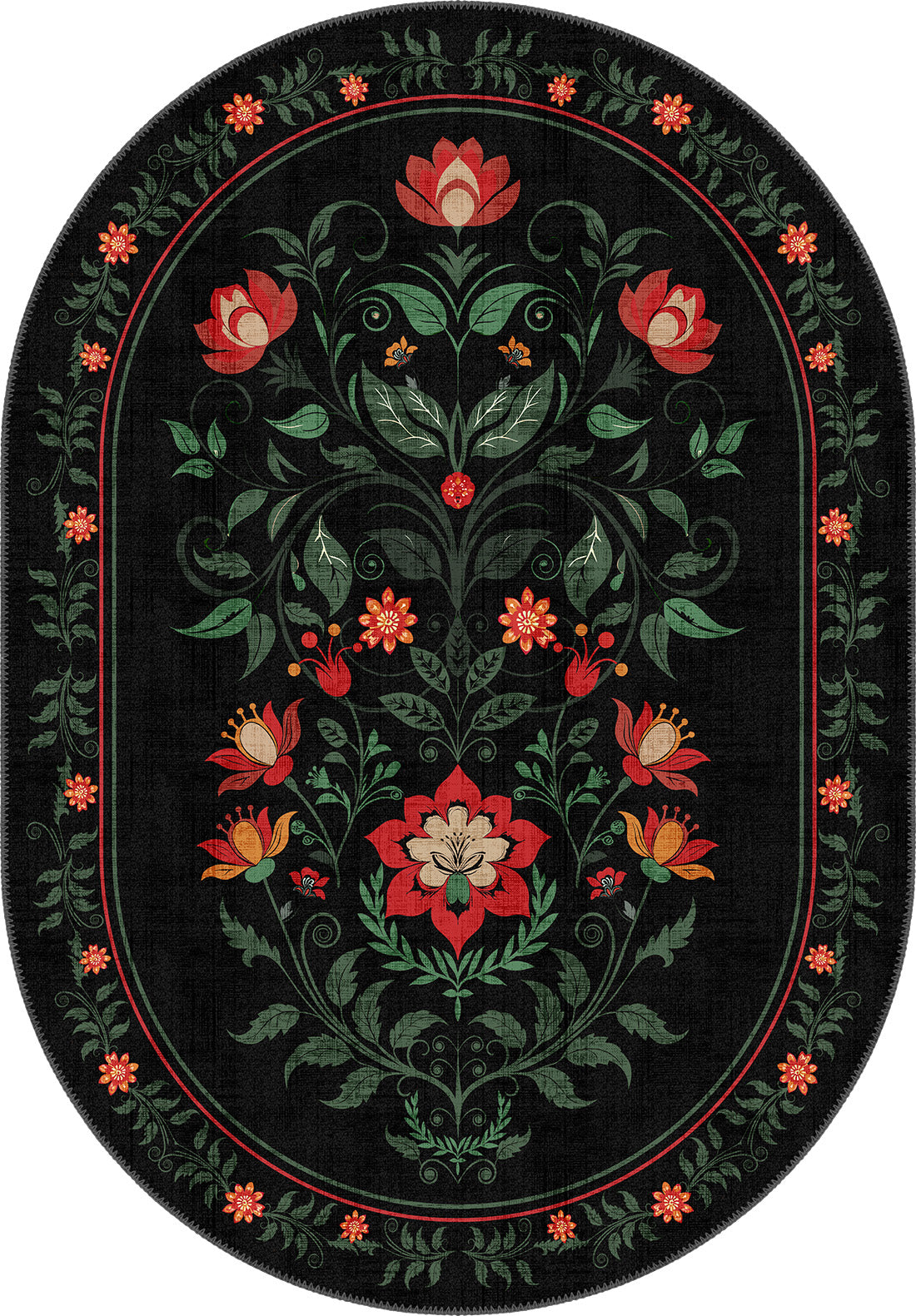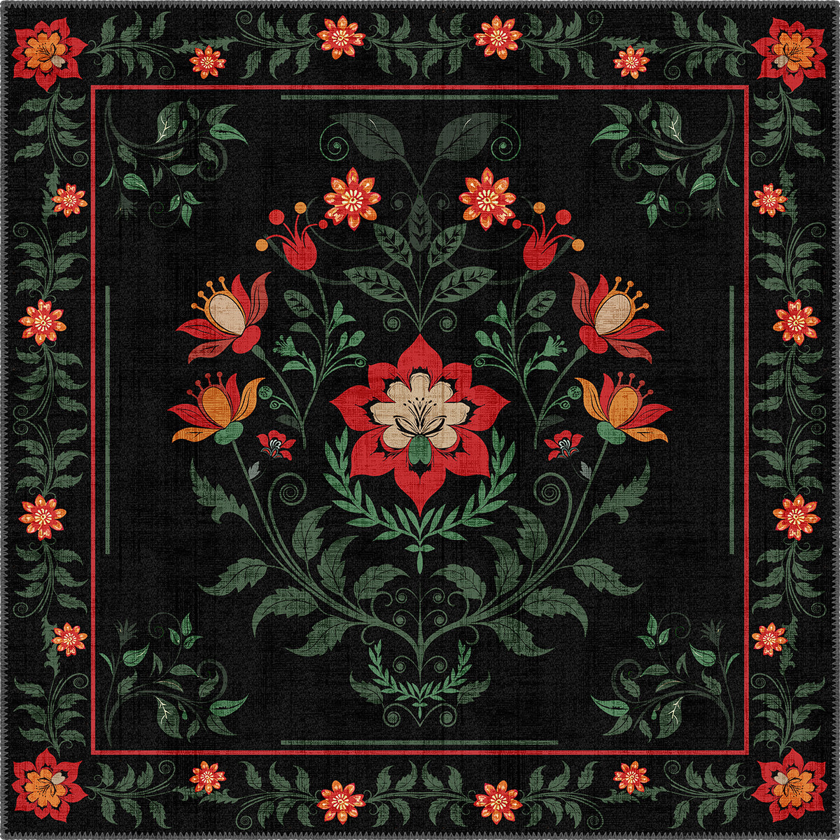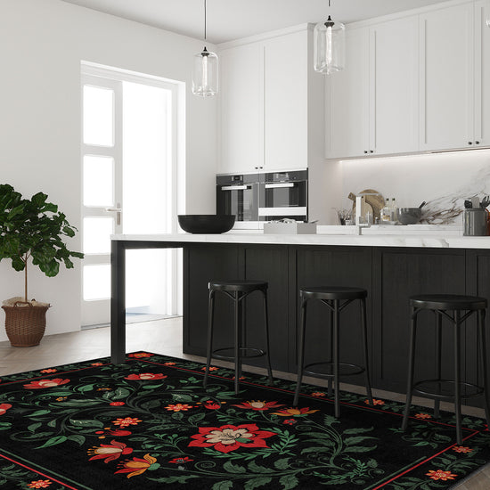 The Amara Black Anatolian Rug embodies the timeless artistry of Anatolian textiles, where intricate florals bloom against a bold black base. The symmetrical design features vivid red and orange blossoms entwined with deep green leaves, bordered by delicate floral garlands. Rich in symbolism and steeped in tradition, this rug adds both elegance and storytelling to your home.
