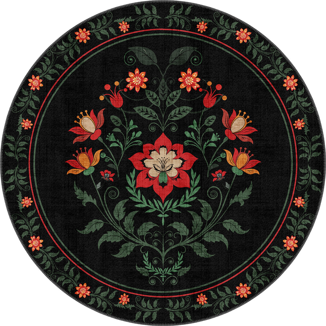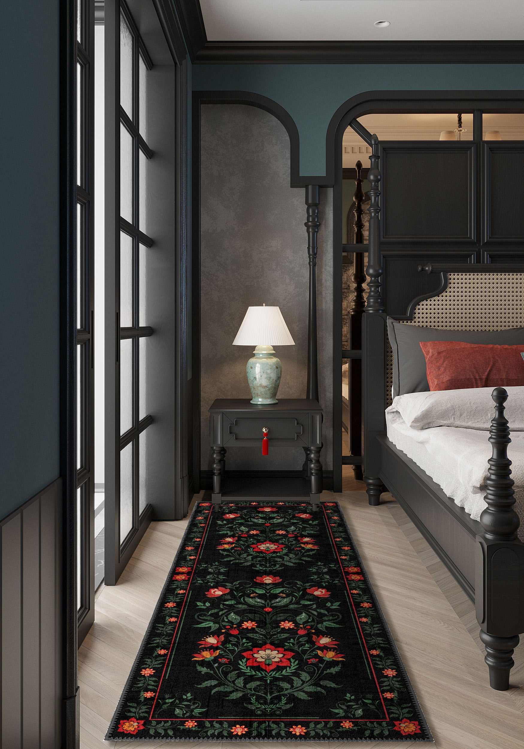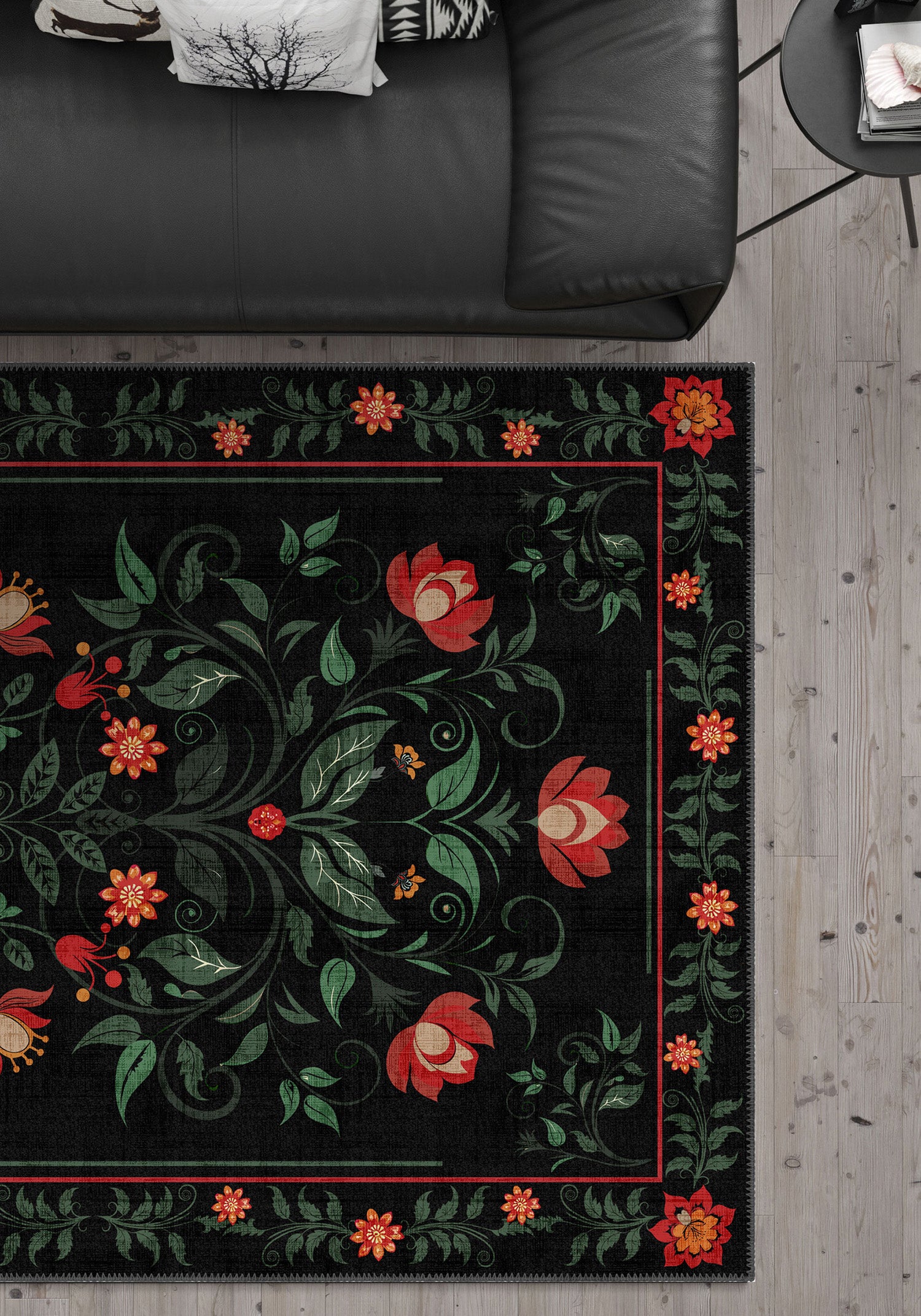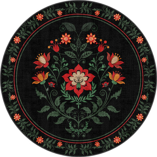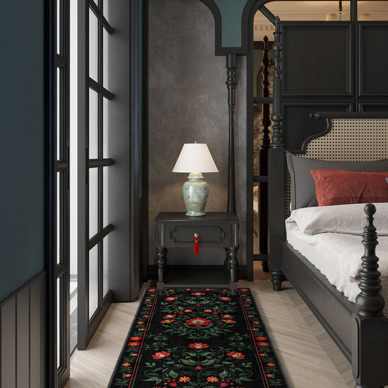 The Amara Black Anatolian Rug embodies the timeless artistry of Anatolian textiles, where intricate florals bloom against a bold black base. The symmetrical design features vivid red and orange blossoms entwined with deep green leaves, bordered by delicate floral garlands. Rich in symbolism and steeped in tradition, this rug adds both elegance and storytelling to your home.