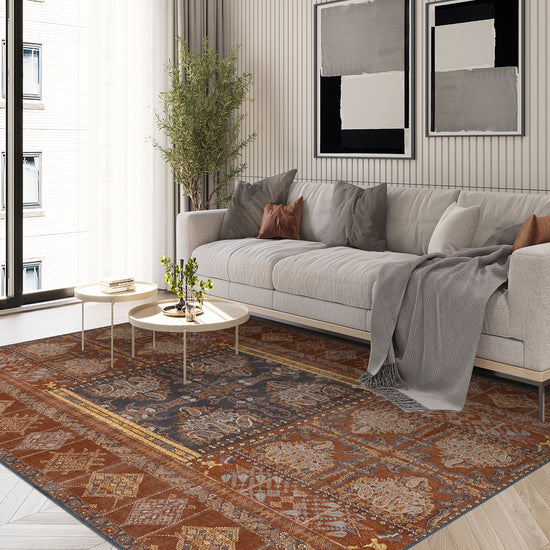 The Andrew Orange Brown Vintage Rug combines timeless design with practical functionality. Its bold mix of colors and intricate patterns make it a standout piece for any room, while its washable fabric ensures long-lasting durability. Whether you're looking to create a cozy living space or add a touch of elegance to a hallway, this vintage rug will bring warmth, style, and sophistication to your home.