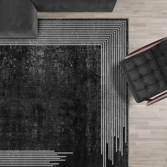 The Ayden Black and White Bordered Rug combines simplicity with a modern edge. Its striking black background contrasts beautifully with clean white linear borders, offering a contemporary design that suits minimalist and modern homes alike. This rug effortlessly enhances any space with its bold, sleek look, creating a dramatic focal point.