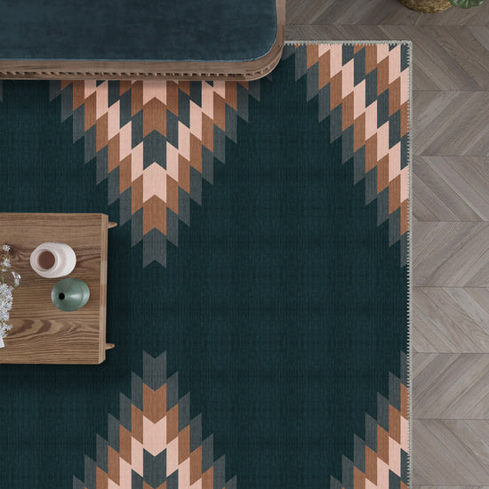 - Bedrooms: The deep teal and contrasting geometric patterns make this rug a cozy and stylish addition to bedrooms, creating a calm yet vibrant atmosphere.