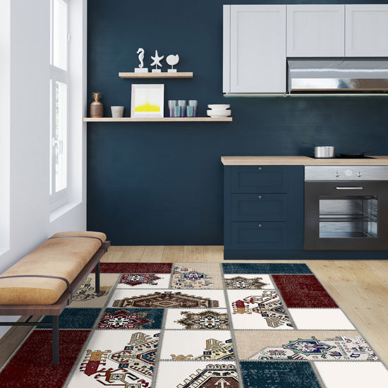 - Eclectic patchwork design with vibrant red, navy, beige, and ivory tones