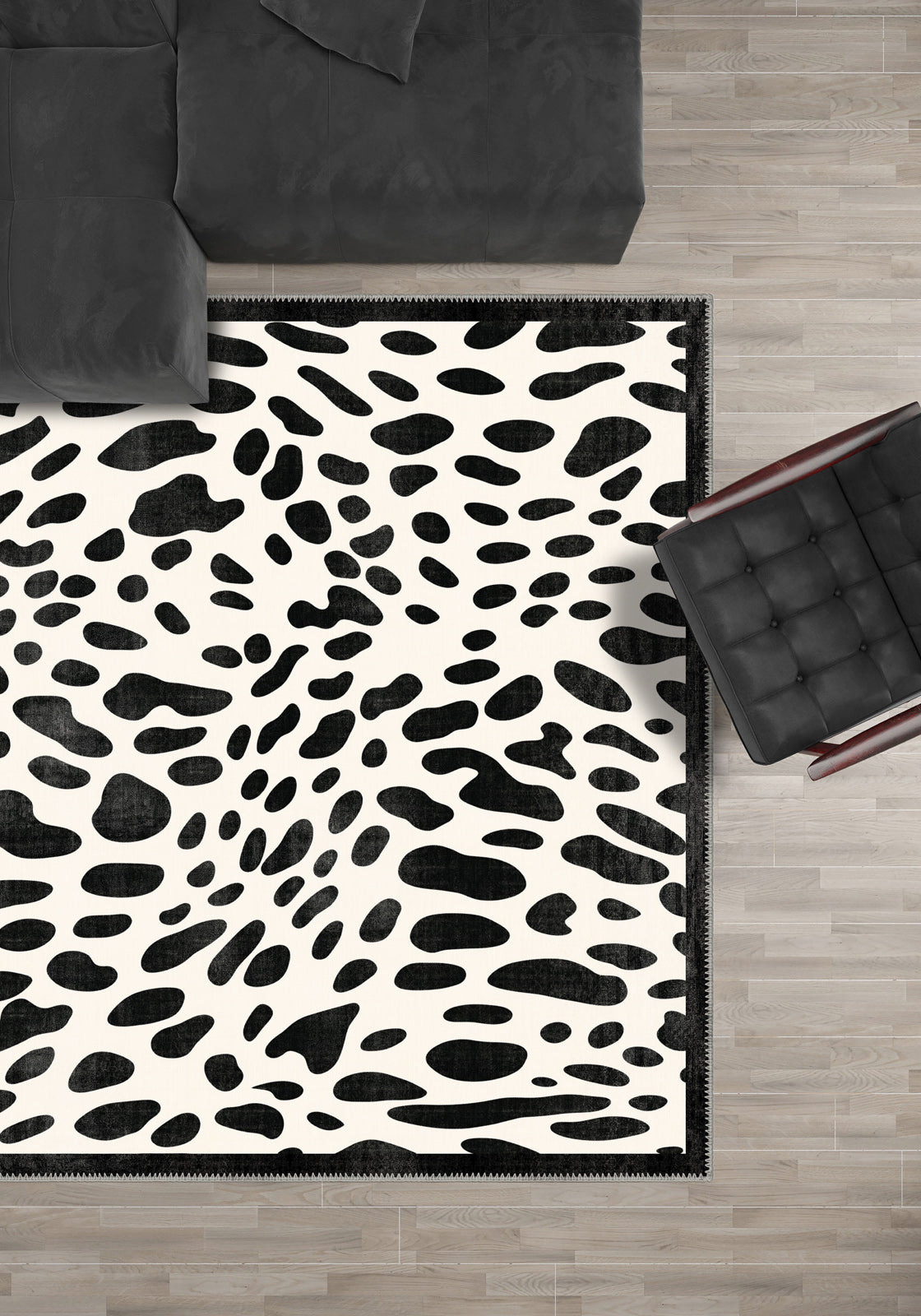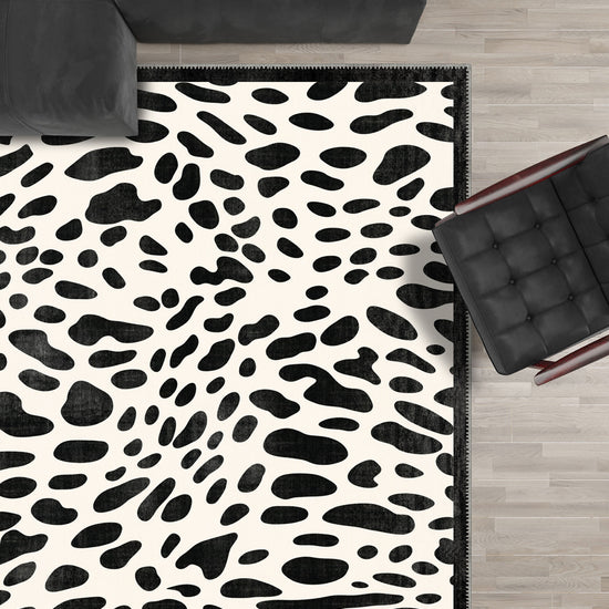 • Dalmatian-Inspired Spots: Featuring the iconic black spots of a Dalmatian, this rug brings a playful, fun aesthetic to any room while the black border adds a sleek finishing touch.