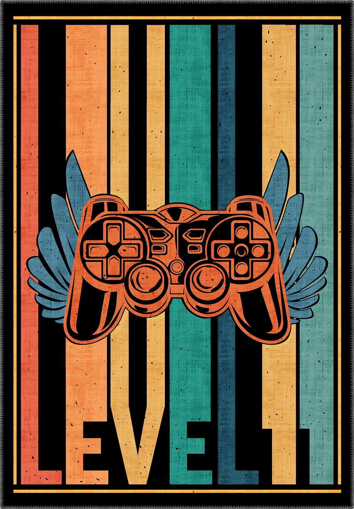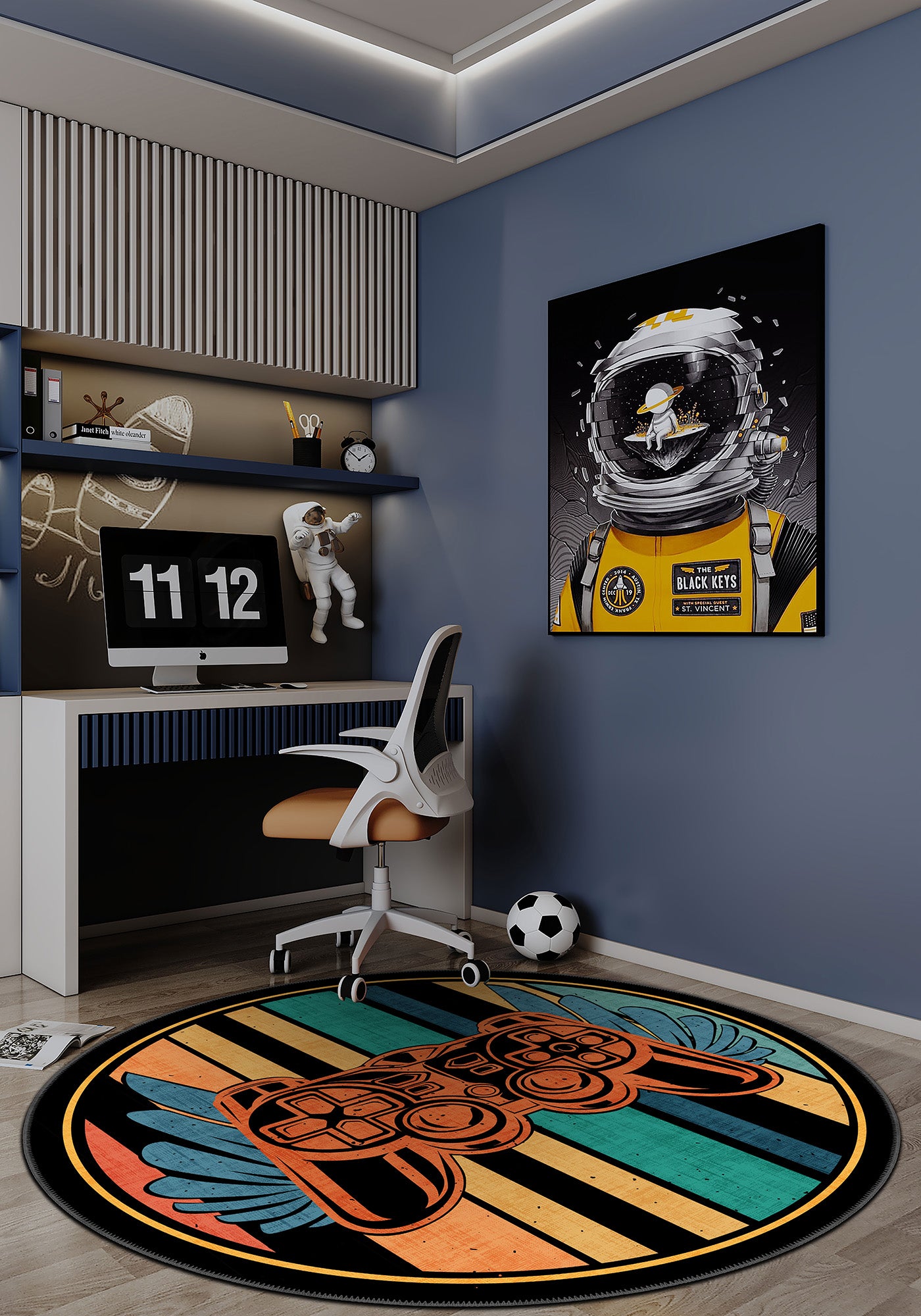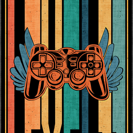 The Darius Retro Gamer Rug brings bold nostalgia and gaming pride to your space. Featuring a vibrant controller motif with wings over striped teal, orange, and amber tones, this retro gamer rug instantly energises any setup. Designed for game lovers and collectors alike, it’s a washable gamer rug that turns your floor into the ultimate level-up zone.