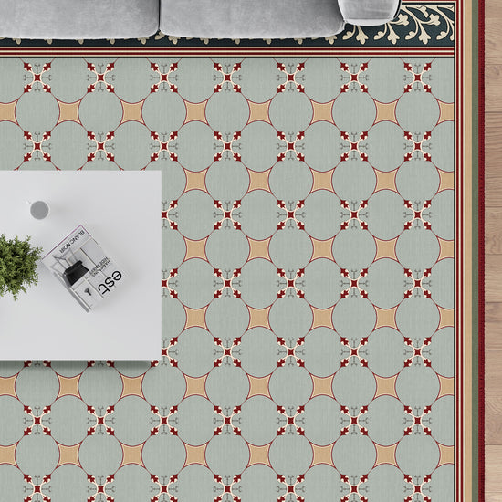 Inspired by the architectural rhythm of European mosaics and noble entry halls, the Eloise Vintage Trellis Tile Rug strikes a perfect balance between symmetry and softness. Its duck egg blue base lays a calming foundation, while terracotta-toned lattice work dances playfully with small ruby floral accents. This tile-inspired motif is framed by a striking black and cream leaf border—like a corridor lined with painted columns.