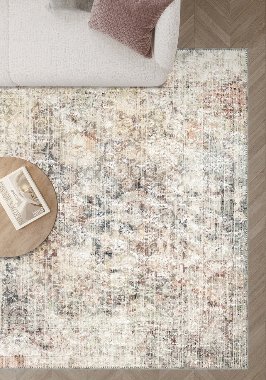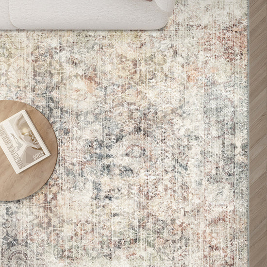 Ethan Washable Erased Flower Rug – Vintage Floral Charm with Modern Practicality