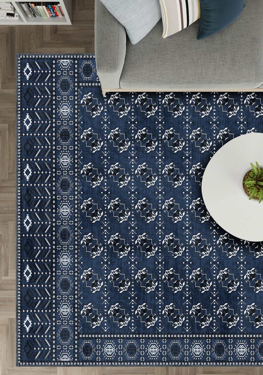 The Kael Blue Washable Rug channels the symmetry and structure of a traditional Bokhara rug, dressed in a deeply elegant navy palette. Its geometric medallions and intricate border deliver timeless charm, while the rich blue brings a grounding calm to your interior.