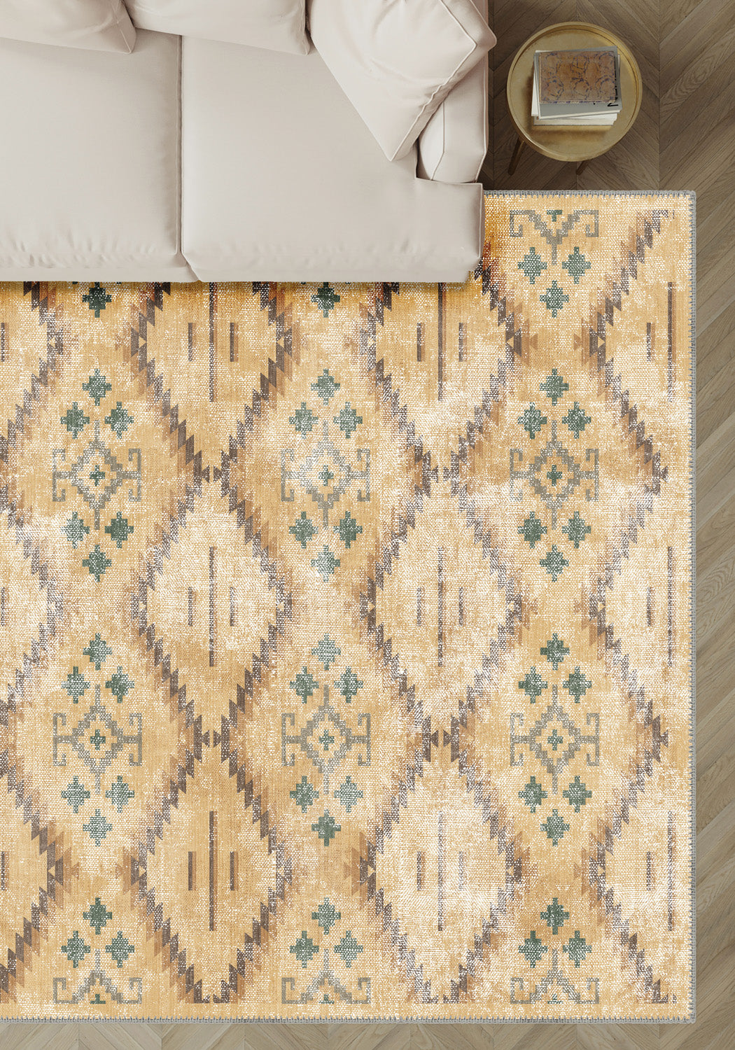 The Leo Yellow Distressed Rug features a dynamic geometric design in warm yellow tones, accented with subtle green and beige patterns. Its distressed finish adds a rustic charm, making it perfect for both contemporary and bohemian interiors. This versatile rug brings a cozy yet stylish feel to any space.