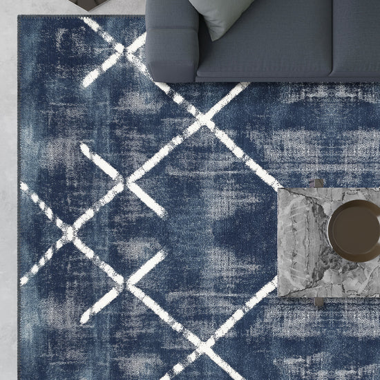 The Margot Washable Blue Rug brings a dramatic and modern aesthetic to any room with its bold, crisscross geometric design over a deep blue background. Perfect for creating a focal point, this rug combines a modern yet timeless pattern with the added convenience of being machine washable, making it both stylish and practical for busy homes.