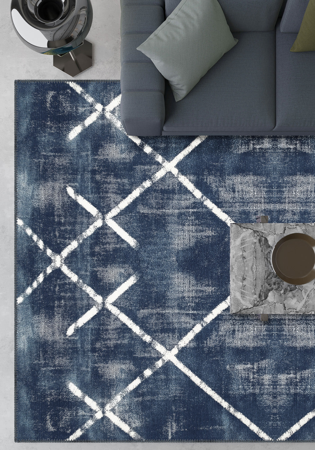 - Striking Geometric Pattern: The Margot rug features a bold diamond crisscross design that stands out against the rich, textured blue background, creating a visually impactful statement piece.