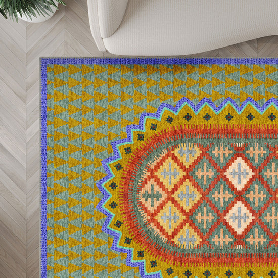 The Maria Colourful Vintage Rug is a celebration of heritage and vibrant artistry. With its striking central medallion surrounded by intricate geometric motifs, this rug blends folk-inspired patterns with an energetic, modern twist. The eclectic mix of golden yellow, deep teal, warm red, and soft blue creates a captivating design that adds personality and warmth to any space.