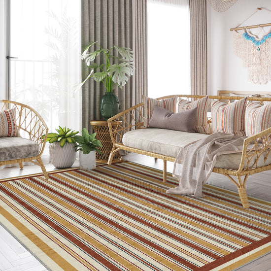 The Maris Colourful Bordered Rug boasts a striking striped pattern in rich tones of red, yellow, and beige, framed by a bold border for a timeless and vibrant appeal. Its warm palette enhances the coziness of any space, making it an ideal choice for adding a touch of charm and personality to your décor.
