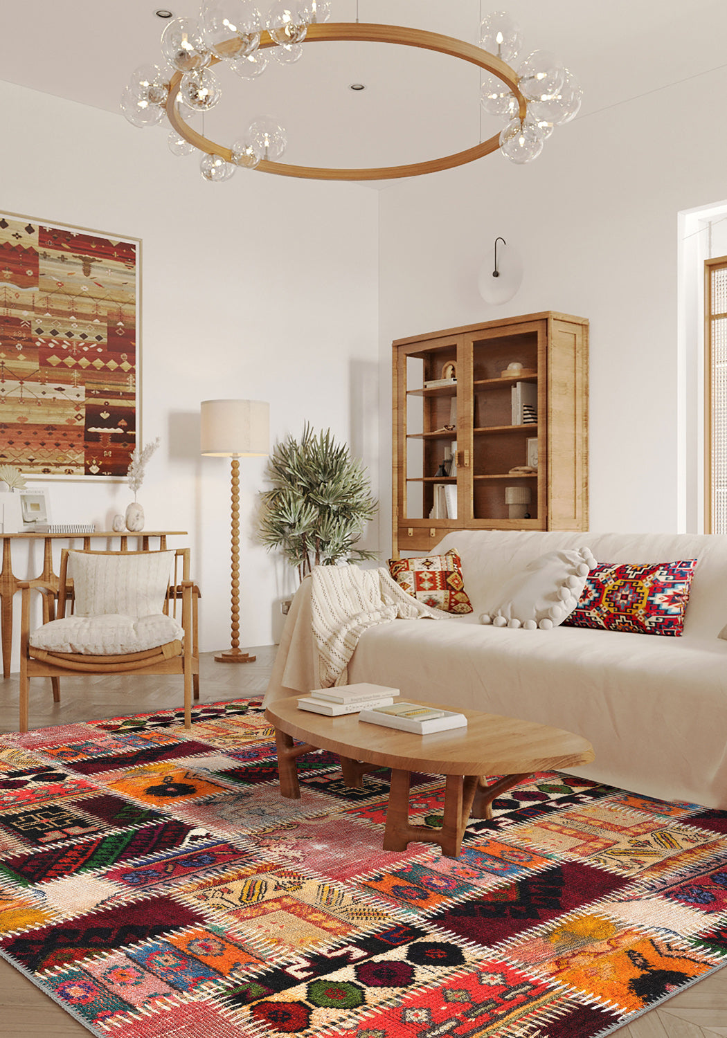 - Eclectic Patchwork Design: The Marius rug features a bold patchwork of geometric shapes and tribal-inspired motifs, creating an artistic, bohemian look.