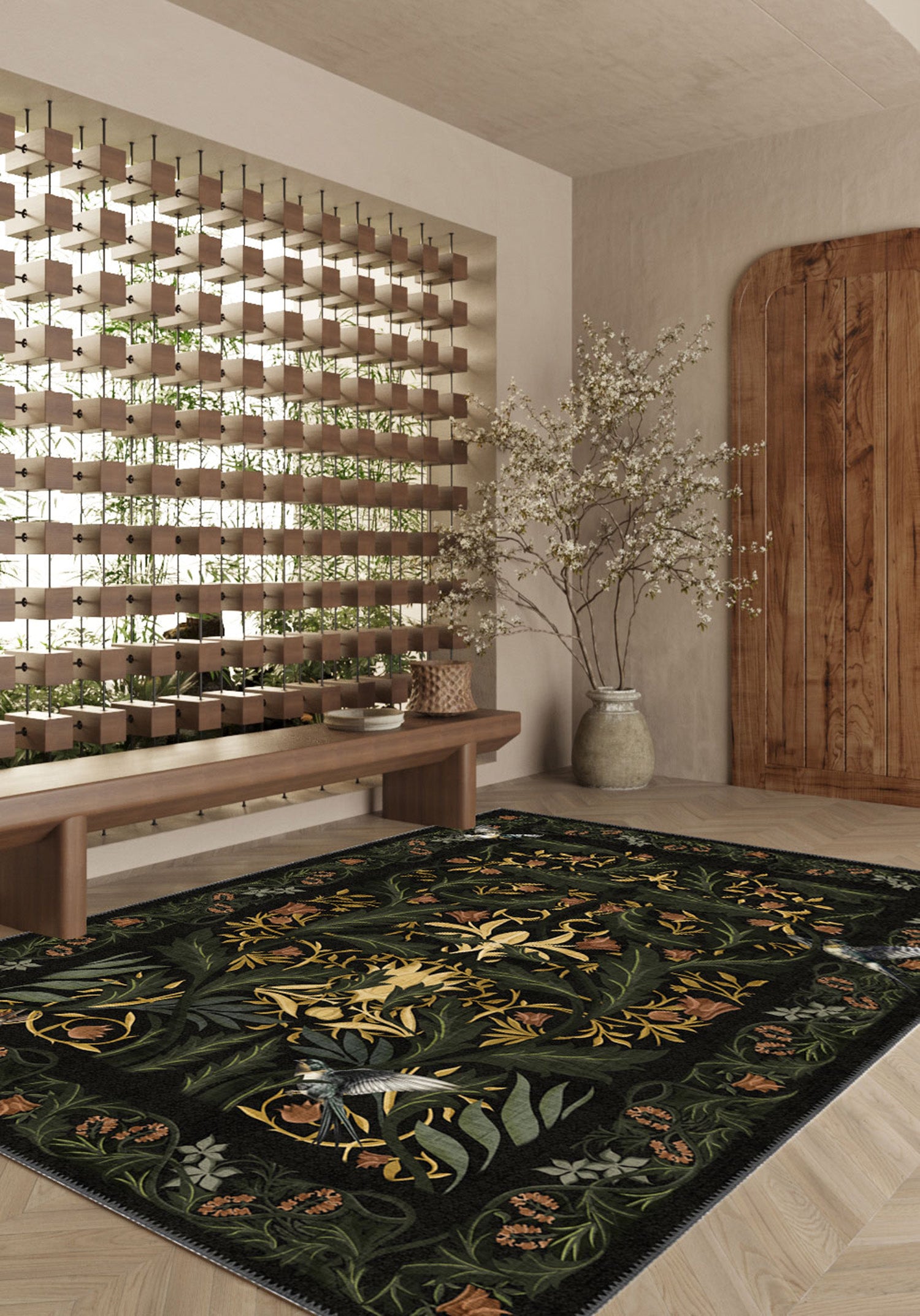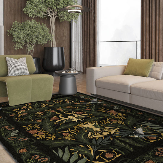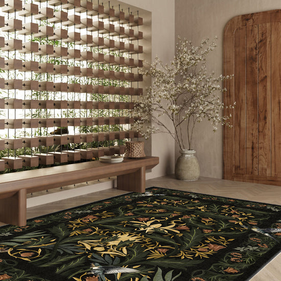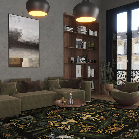 Merillo Black Botanical Rug – A Bold Fusion of Nature and Artistry