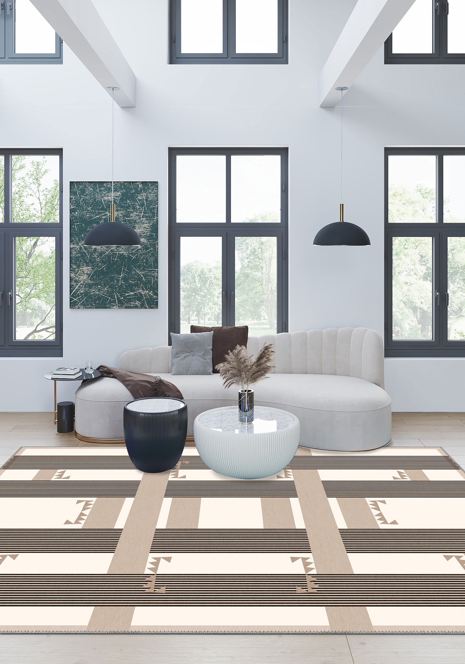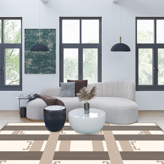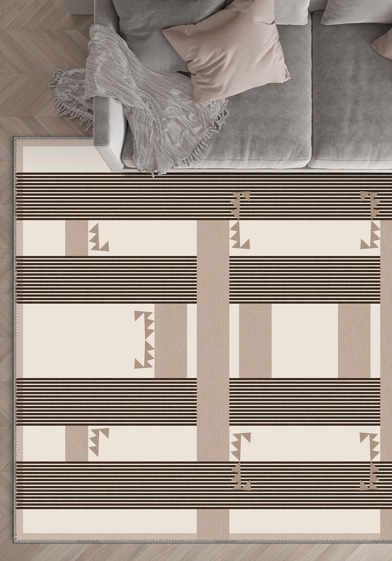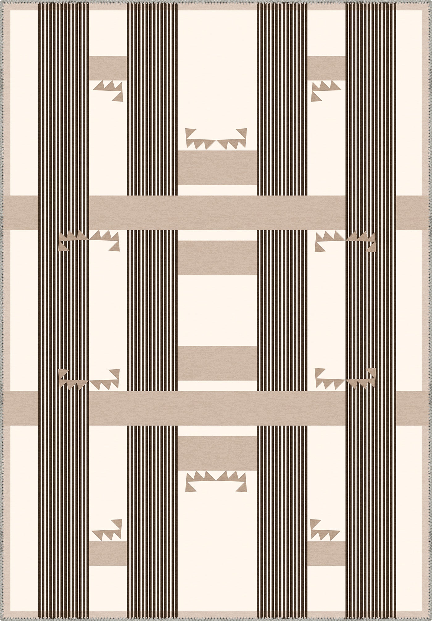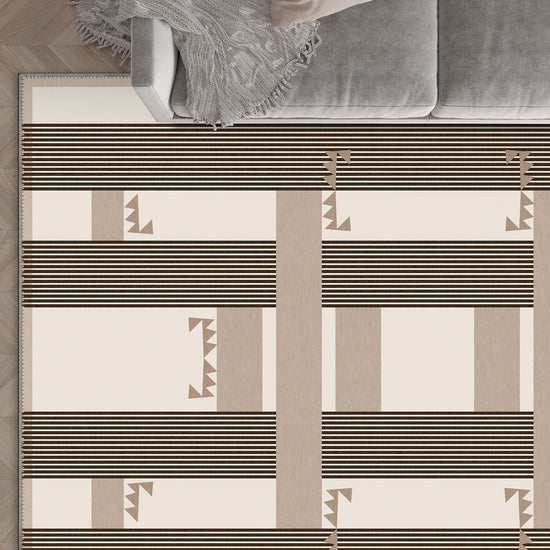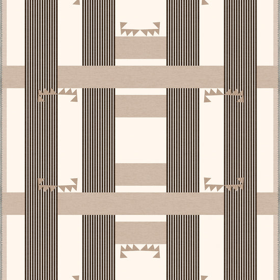 - Ivory base with slim espresso stripes and tribal triangle motifs for a geometric rug appeal