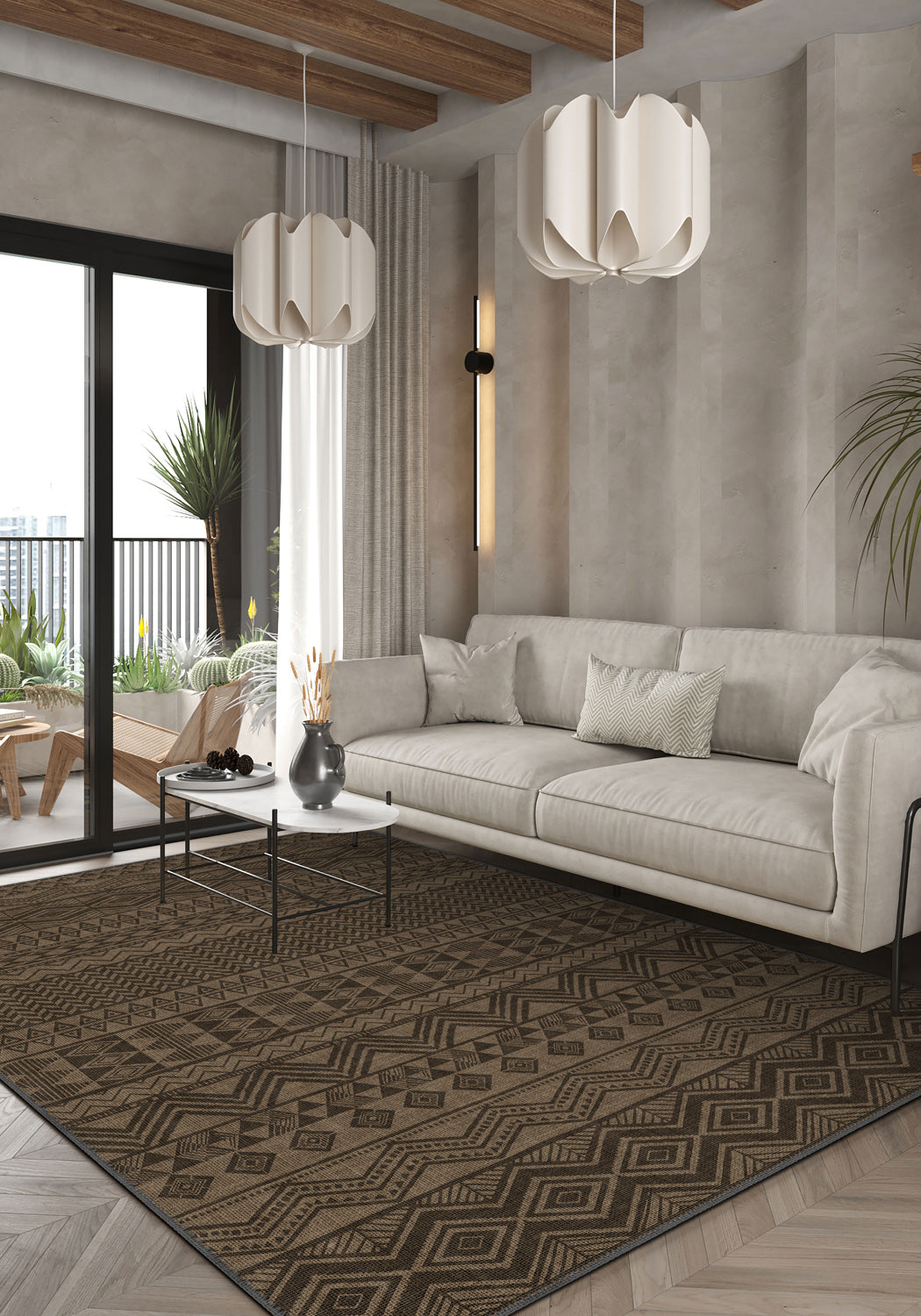 - Rhythmic tribal patterns that bring movement and depth to any floor