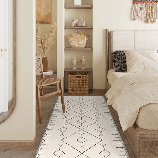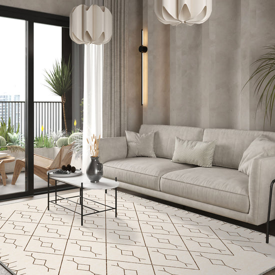 The Nira White Berber Rug captures the essence of timeless simplicity with a quietly powerful design rooted in Berber symbolism. Hand-drawn inspired lines form rhythmic diamond and stick motifs, creating a tribal pattern that whispers heritage into any room it enters. But this is not a loud rug—it’s a grounded, gentle soul that complements, calms, and uplifts. Set against an ivory-white base, the slender brown lines offer a minimalist nod to traditional Moroccan Berber weaves. It's the kind of rug that transforms a room with its lightness—visually, emotionally, and practically.