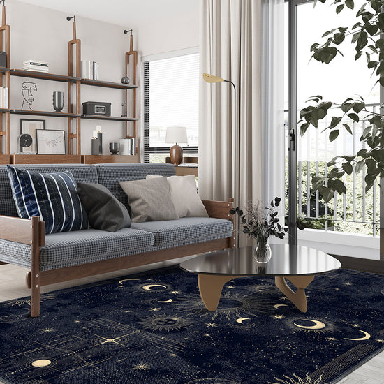 The Noctara Navy Celestial Rug belongs to our washable rugs collection, combining bold artistry with modern functionality. Its low-profile construction allows furniture to sit comfortably, while the durable weave ensures it maintains its cosmic elegance in busy homes.