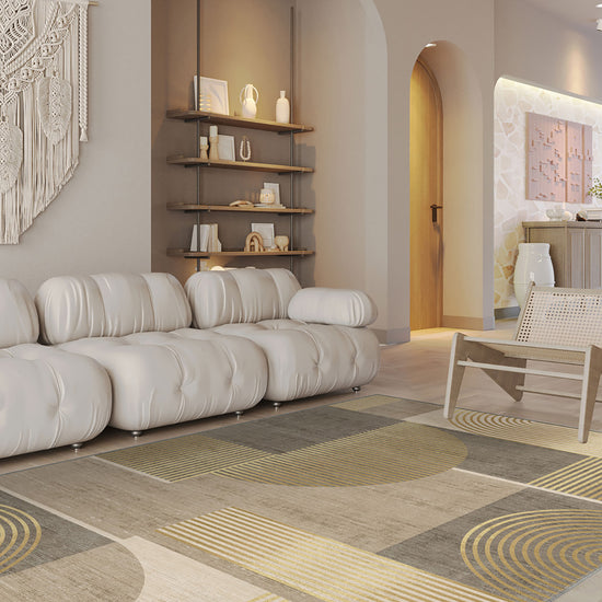 The Peyton Gold Geometric Rug brings contemporary elegance to your home. Its bold geometric design in luxurious gold tones adds a touch of glamour to any room. With its durable, machine-washable construction, this rug is ideal for modern living spaces that demand both style and practicality.