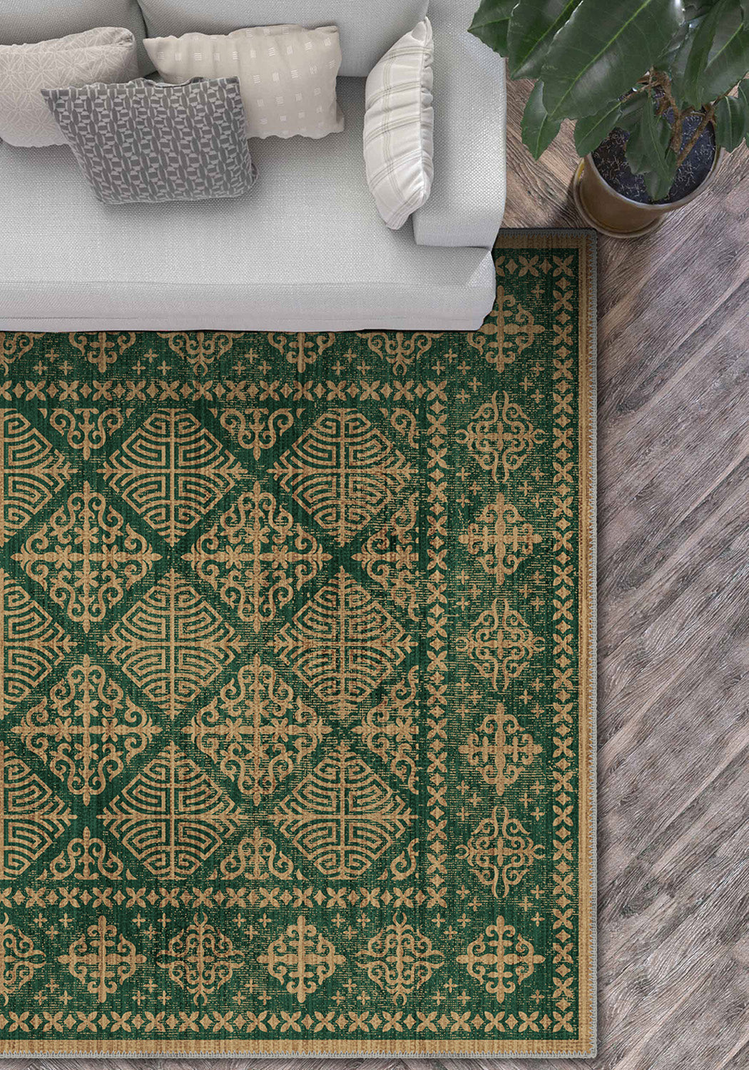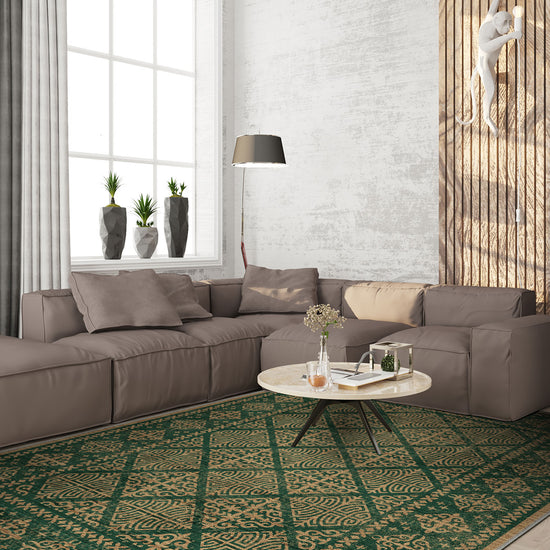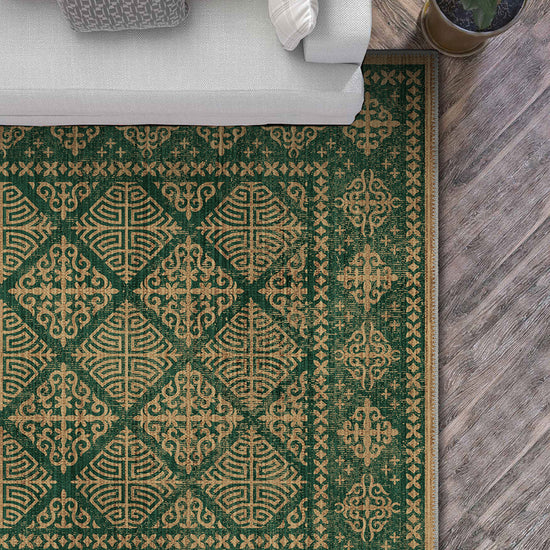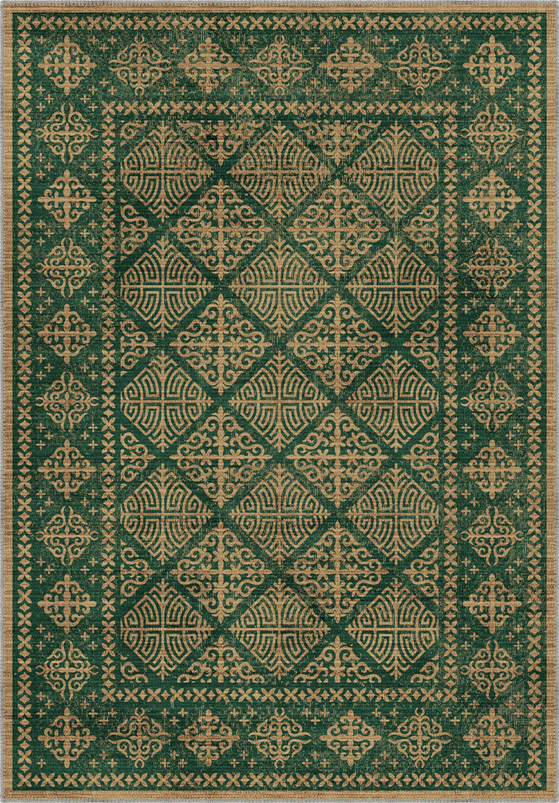 With its lush emerald base and golden Celtic-inspired motifs, the Rhean Green Celtic Rug brings the spirit of ancient folklore into your modern sanctuary. The hypnotic diamond latticework and ornamental medallions feel like something lifted from the floor of a sacred hall deep in the Highlands—majestic, rooted, and infinitely stylish.