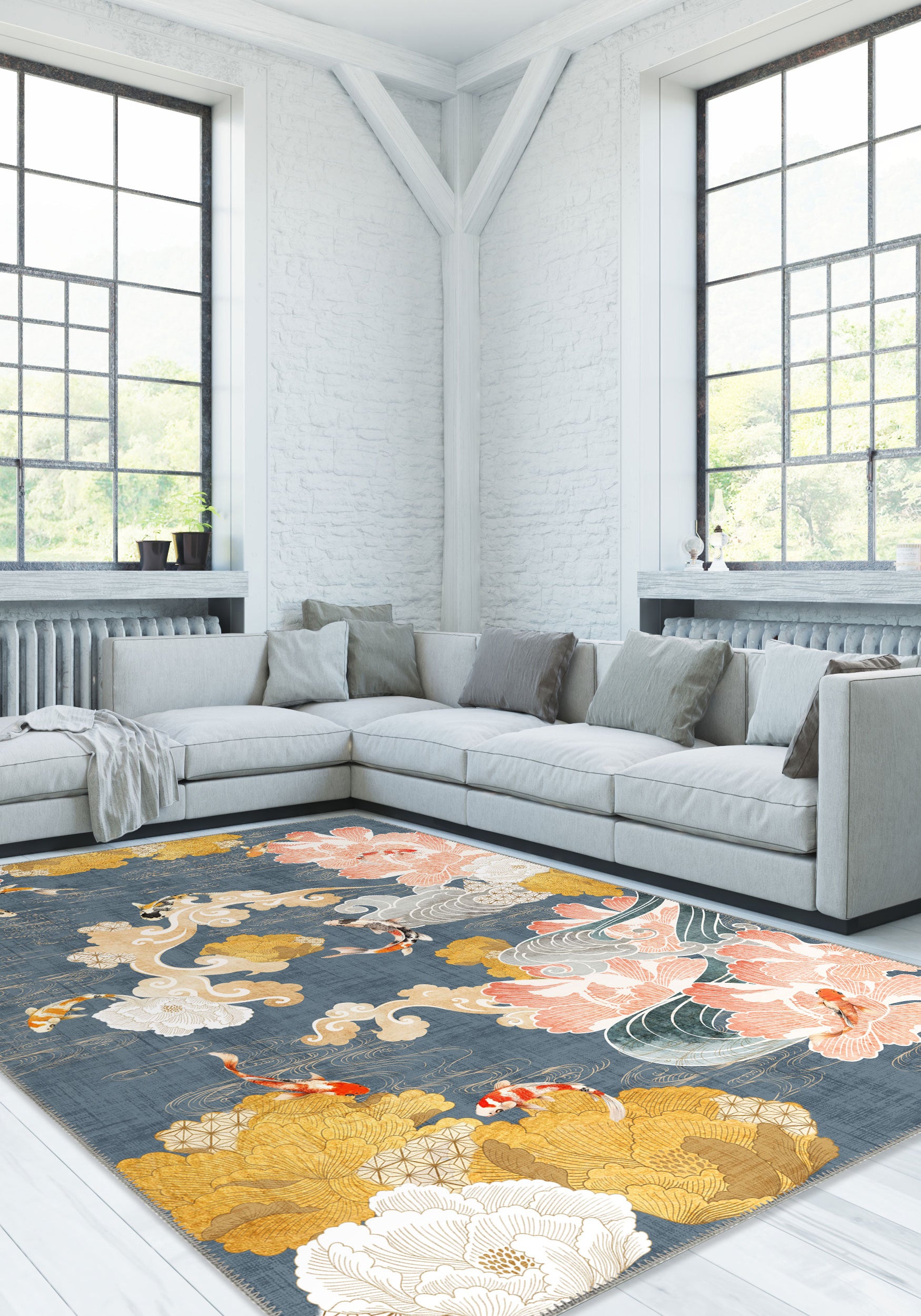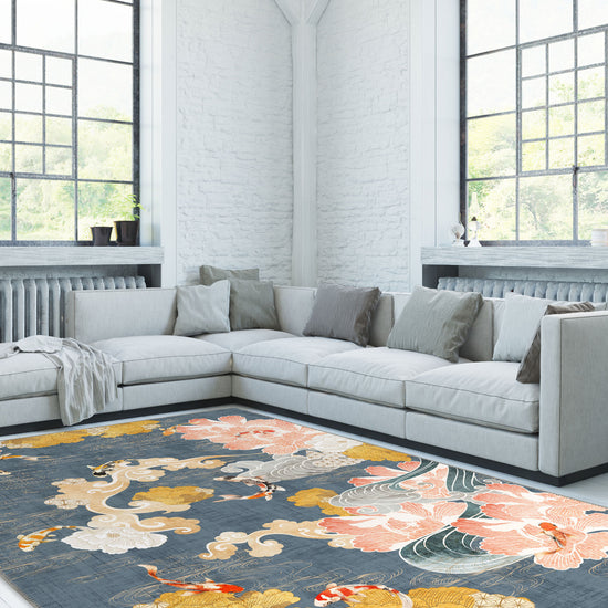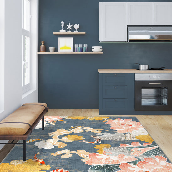 The Suki Floral Koi Rug is a dreamy homage to the elegance of Japanese aesthetics, where koi fish glide through painterly water and golden blooms unfurl like whispers. It’s not just a rug—it’s a poetic vignette of nature, of balance, of quiet movement. The painterly blues form the perfect base for its serene garden of soft peaches, golds, and creamy whites. Delicate, yet confident. With every step, you wander through a floating garden of peonies and cloud scrolls, while koi fish dance around your toes in a tranquil choreography.