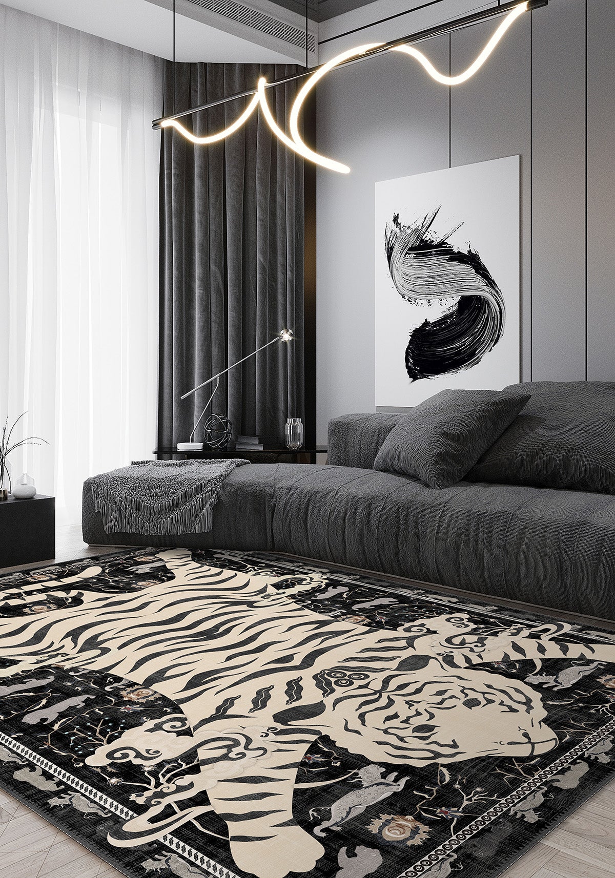 The Tashi Black and White Tiger Pelt Rug is a bold reinterpretation of traditional Tibetan tiger rugs, reimagined for the modern home. With its commanding tiger pelt silhouette stretched across a richly illustrated black backdrop, this rug fuses heritage symbolism with contemporary graphic flair. From its mystical border of crawling panthers and ancient cloud motifs to the watchful eyes hidden in its symmetrical frame, every inch tells a story of power, guardianship, and sacred design.