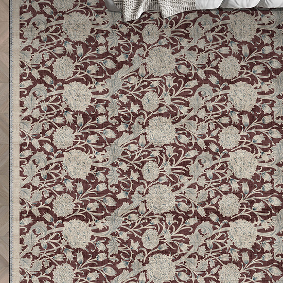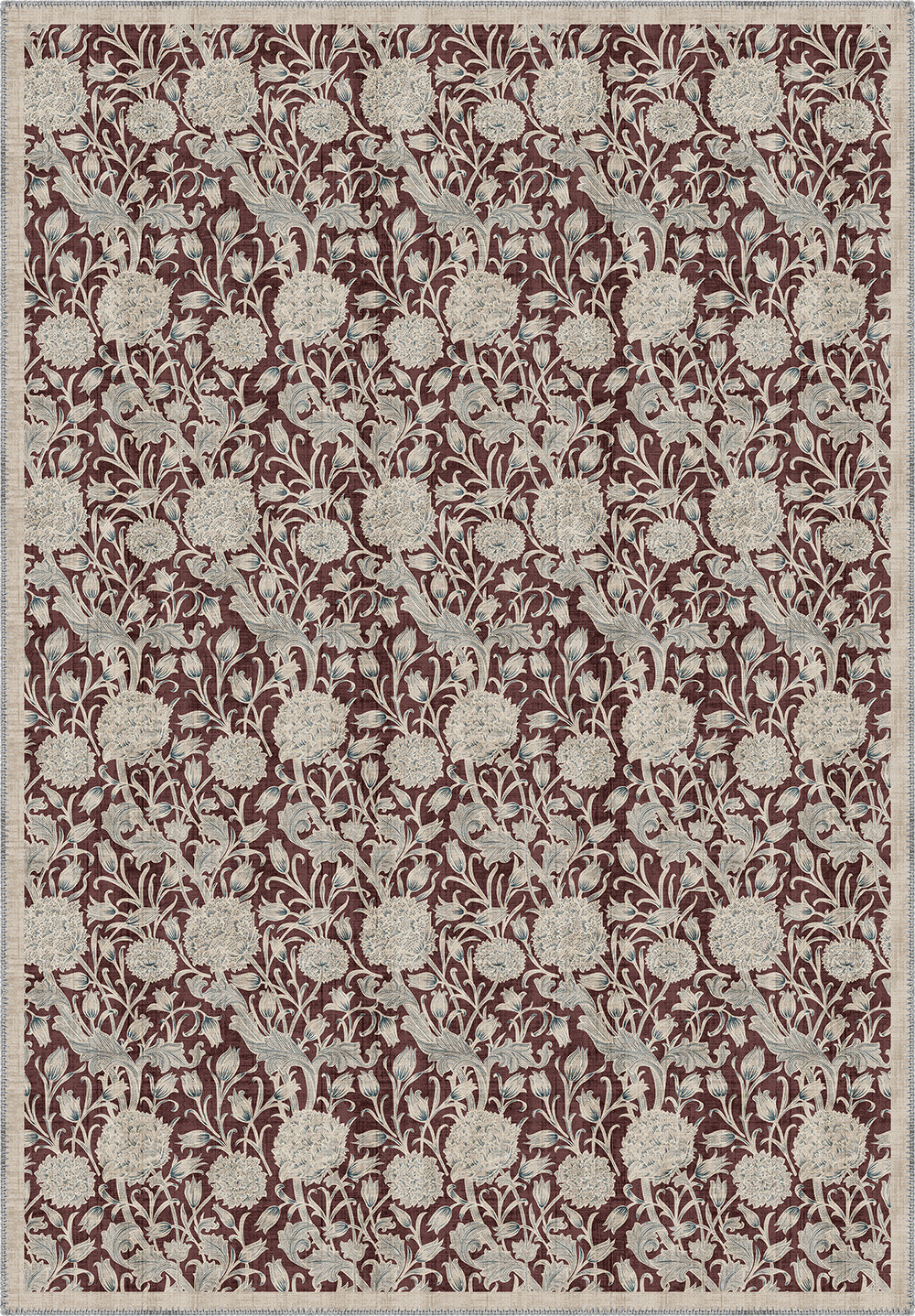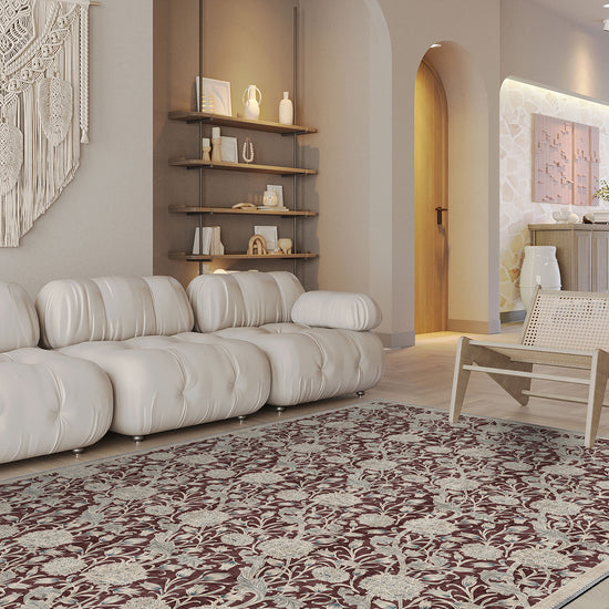 The Thalassa Burgundy Vintage Rug evokes the charm of historic English parlours and faded botanical prints. Its deep claret background is rich and grounding, allowing the delicate ivory florals and perched birds to bloom with grace. Perfect for lovers of cottagecore, slow living, and soulful interiors, this rug feels like poetry underfoot.