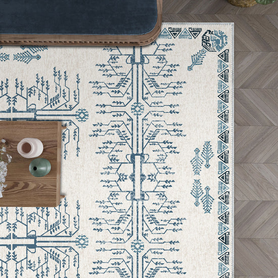 Uncover the intricate meanings behind the Tigris Phoenix and Dragon Kilim Rug, a masterpiece that weaves together ancient Turkish symbols in a modern design. This beautiful kilim draws its inspiration from the revered Tree of Life, representing growth, protection, and the cycle of life. The deep blue, a color rich in Turkish history and culture, adds an extra layer of significance, symbolizing protection, serenity, and the connection to the vast skies and waters. The calming blue and cream tones enhance the deep symbolism, making it an elegant yet meaningful addition to any room.
