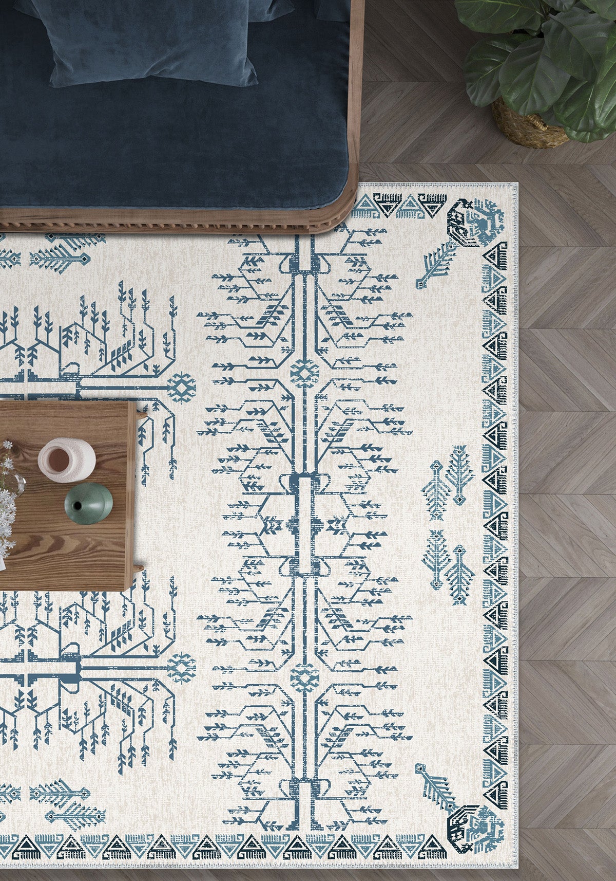 • Tree of Life Motif: At the heart of the rug, the detailed tree symbols depict life’s journey and its continuity, with branches extending upwards symbolizing growth and renewal.