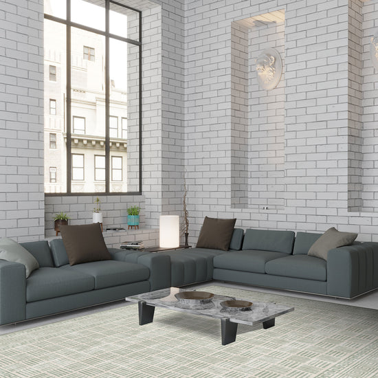 The repeating linear motif across the centre gives this soft green rug a beautifully rhythmic texture, while the framed border adds definition and refinement. It has the timeless appeal of Art Deco inspired rugs, yet its muted tone keeps it fresh and modern.