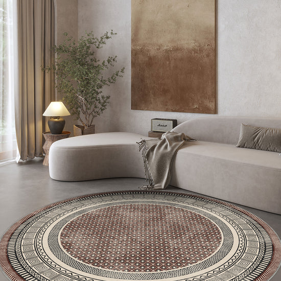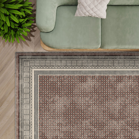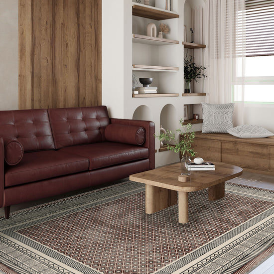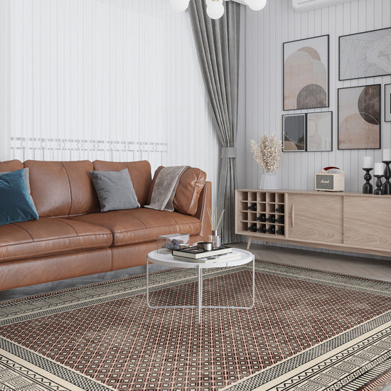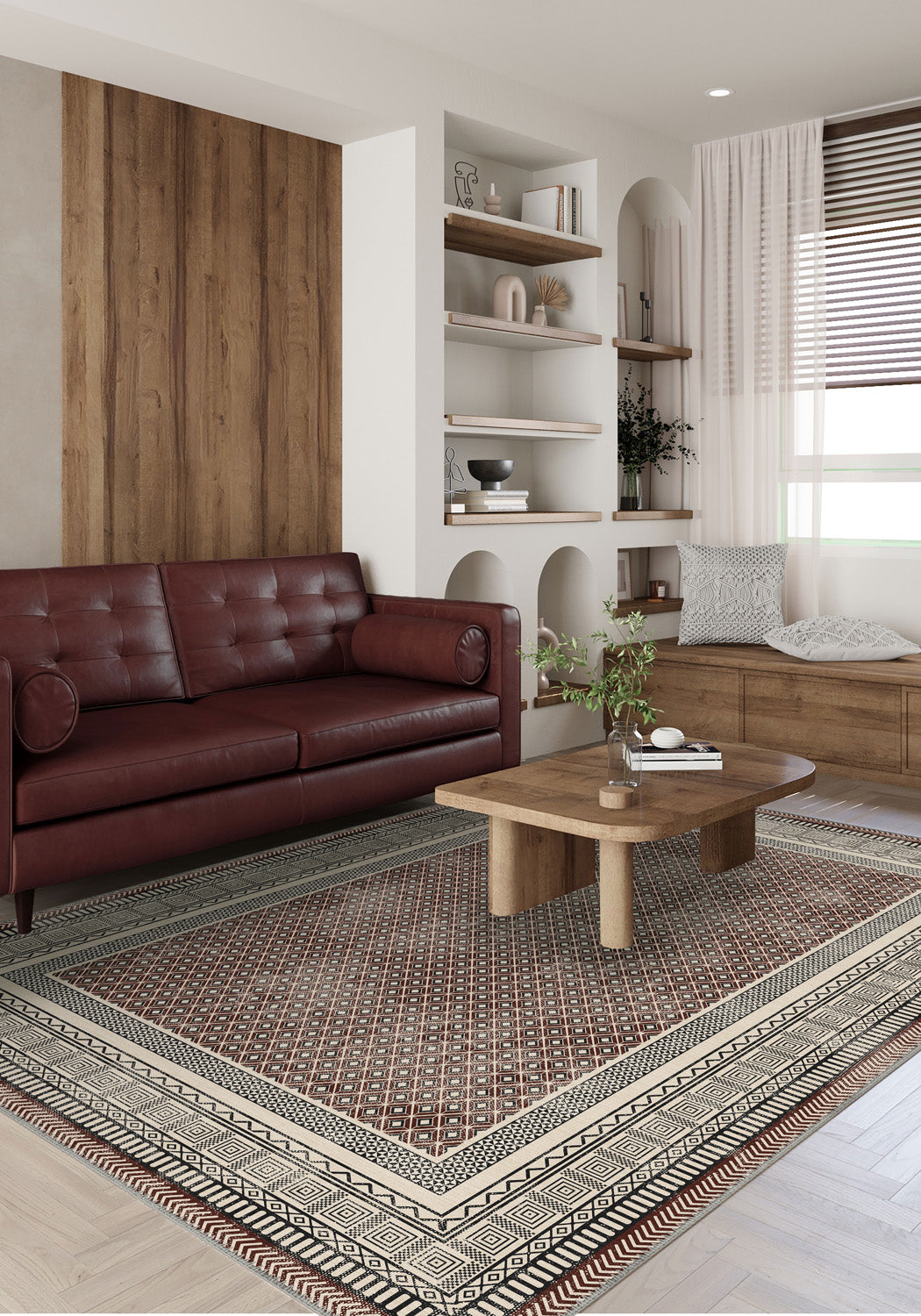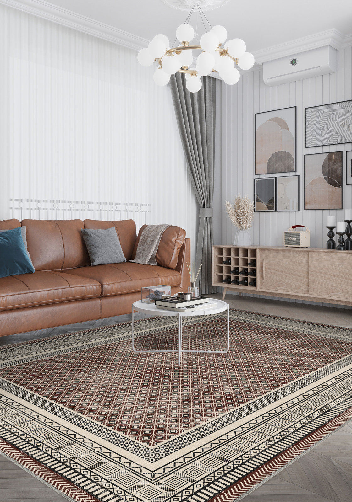 Elevate your space with the timeless elegance of the Wynn Bordered Washable Rug. This rug combines intricate geometric border patterns with a refined central diamond motif, bringing sophistication and balance to any room. The warm color palette and detailed design create a versatile addition, perfect for both traditional and contemporary interiors. Crafted for modern living, this rug is not only stylish but also practical with its washable design for effortless upkeep.