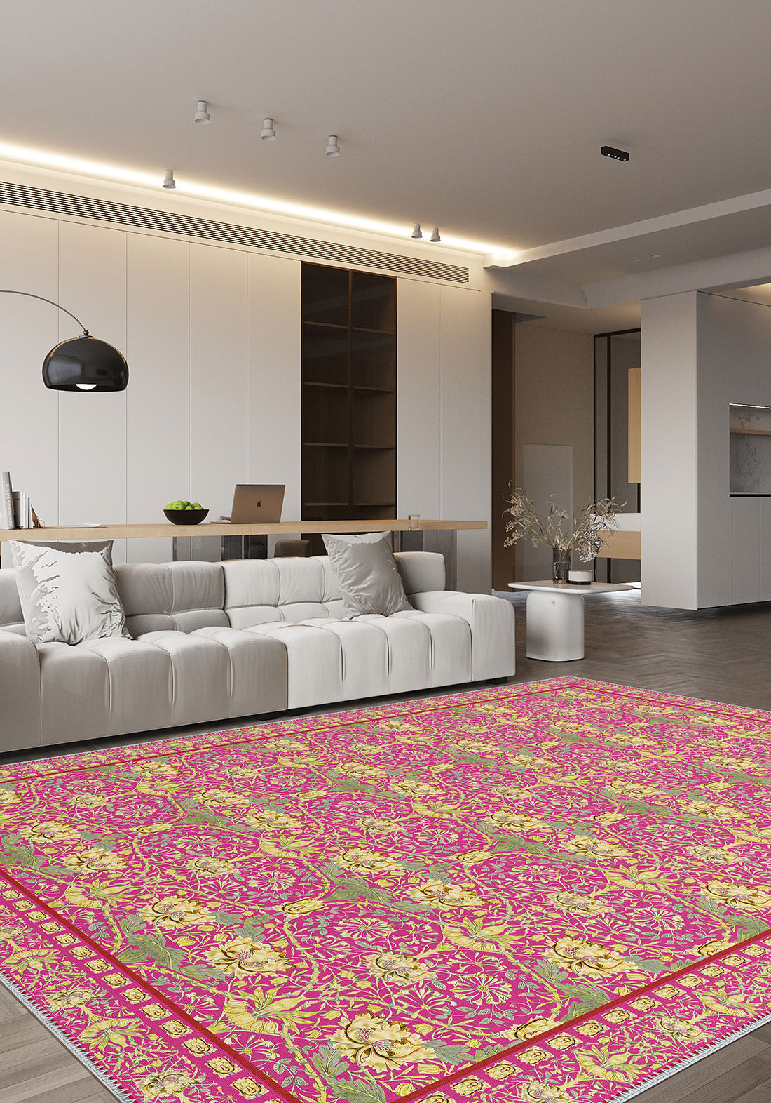 Bring vibrancy and charm into your home with the Zachary Vintage Pink Rug. Featuring a delightful combination of vivid pink hues, soft golden-yellow floral motifs, and refreshing green accents, this rug exudes a unique personality. The intricate, vintage-inspired design is framed by a decorative border, making it the perfect blend of tradition and contemporary flair.